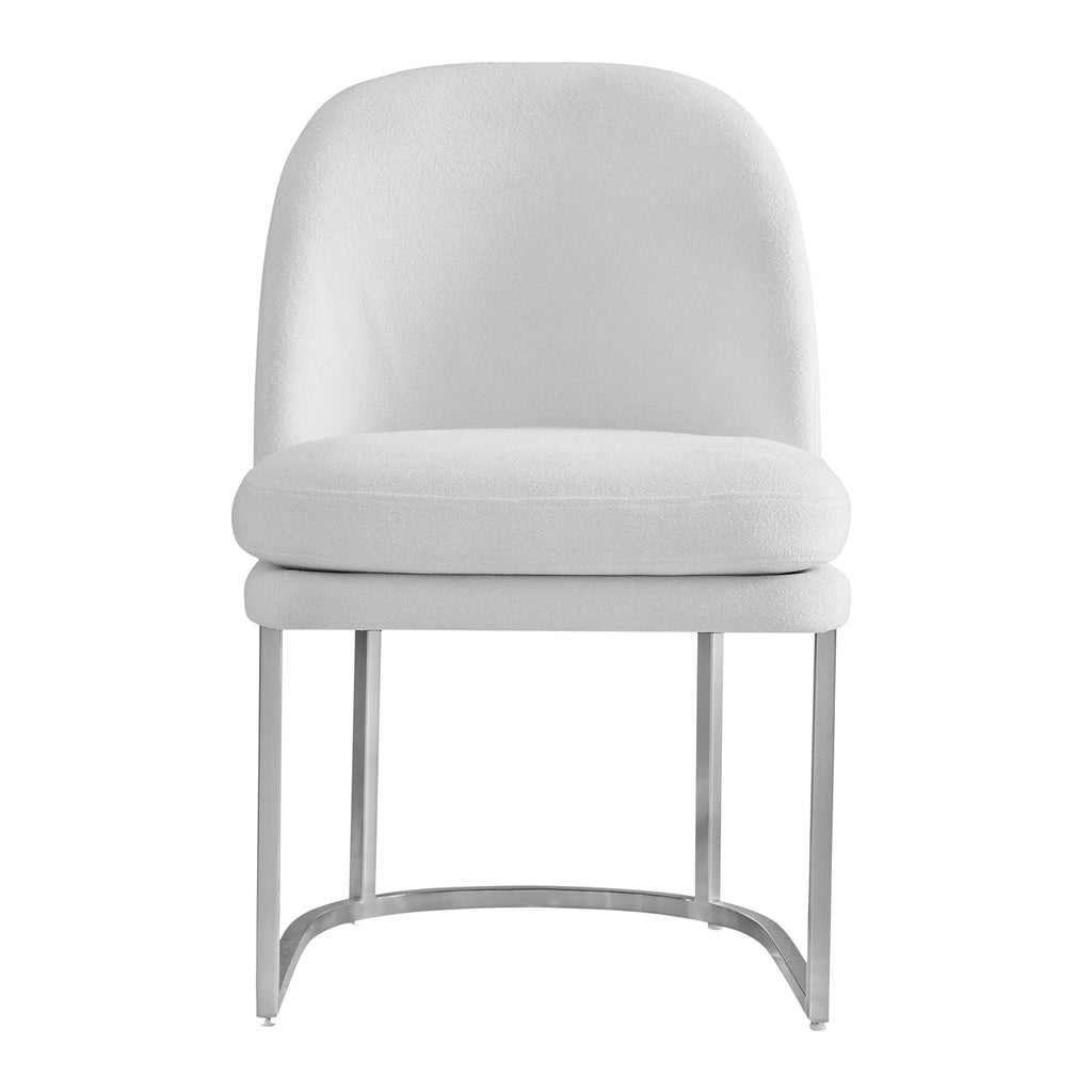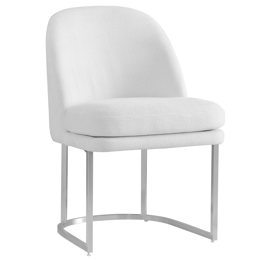 Pearl Dining Chair is a modern dining chair with a curved seat back and a brushed silver base featuring a boucle style performance fabric with a soft chenille and textured circular loop yarn for a subtle texture in an elegant ivory color.