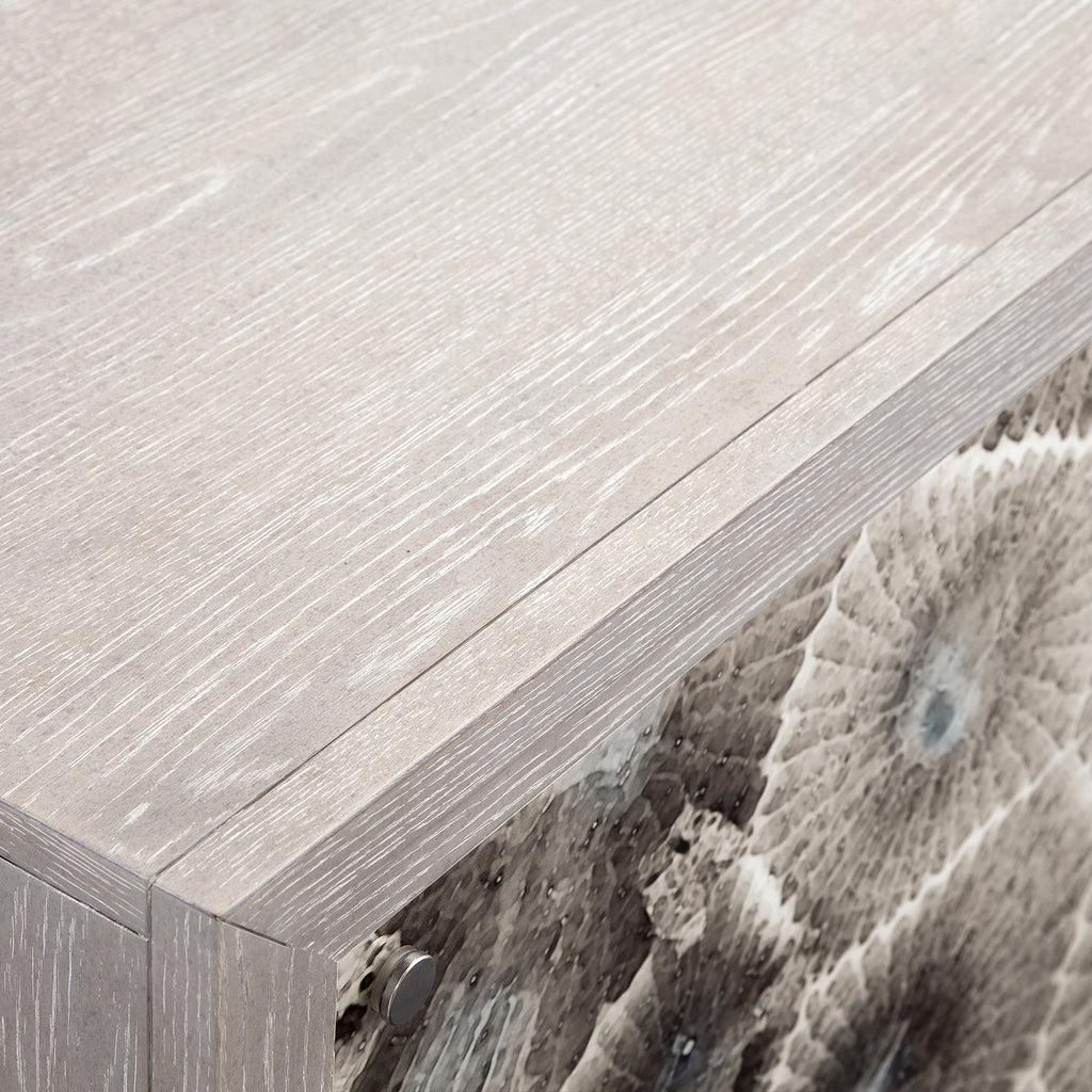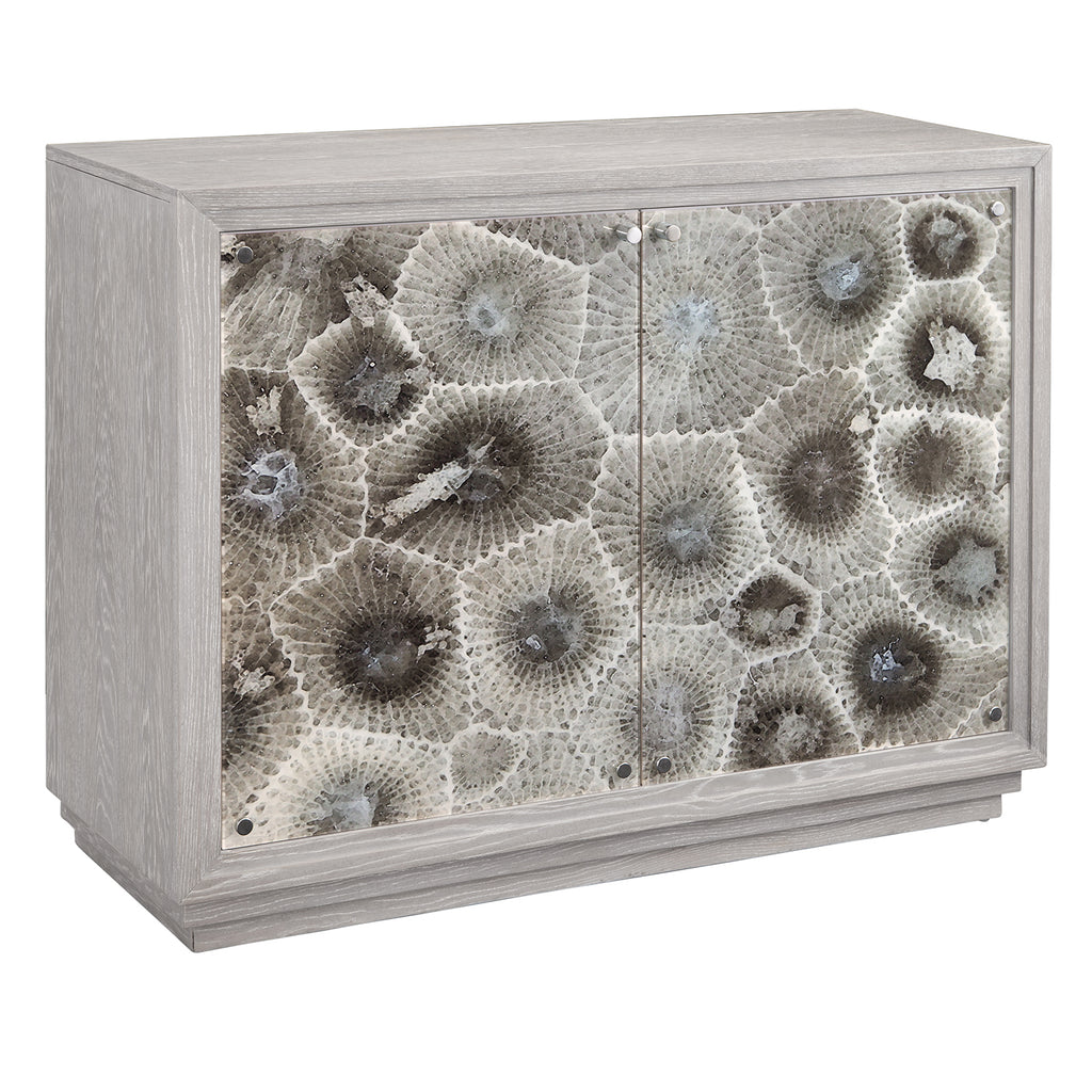The Peninsula Ridge Bar Cabinet embodies modern design crafted from solid rubberwood and oak veneers in a soft driftwood gray finish. The two doors feature a unique Petoskey stone pattern, adding a touch of charm. Inside, discover thoughtful details like stem storage and an adjustable shelf. Peninsula Ridge blends style and functionality, creating a stylish addition to any space.