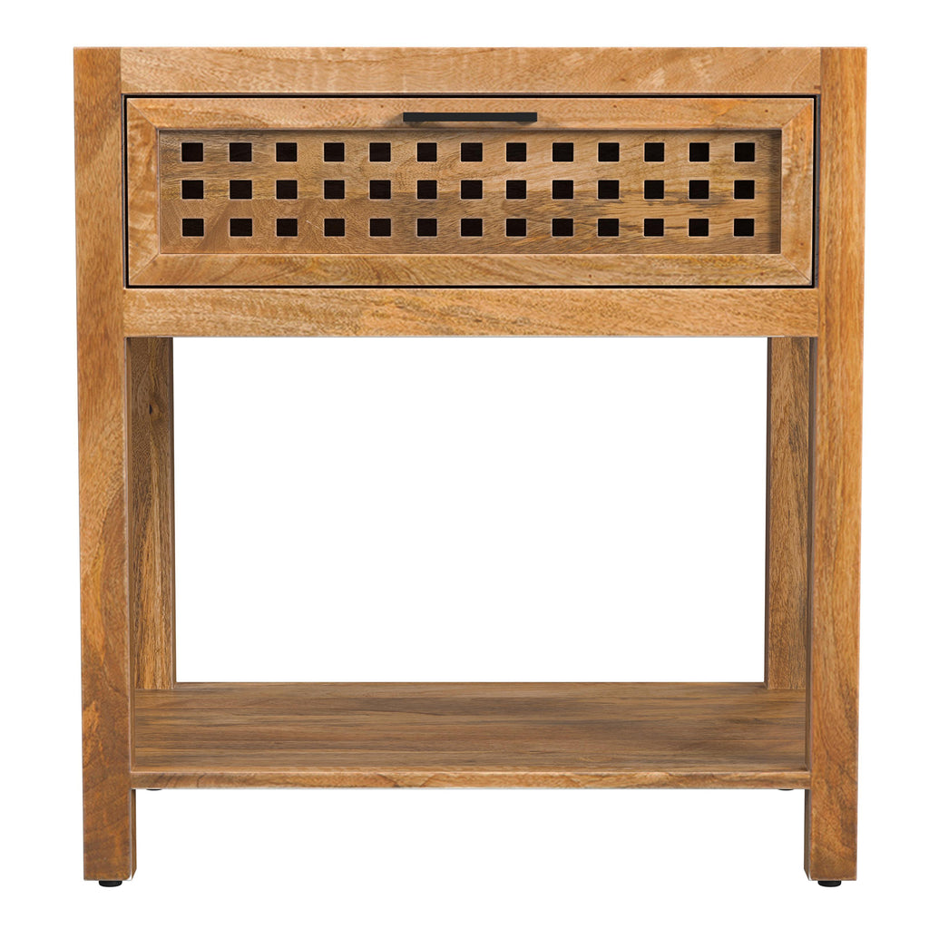 The Pentak End Table features a beautiful natural mango wood finish that brings in varying brown tones. The single drawer is accented with open pierced fretwork detailing. The matte black iron bar drawer pull gives this boho style some industrial flair. Also includes lower shelf for some additional storage space.