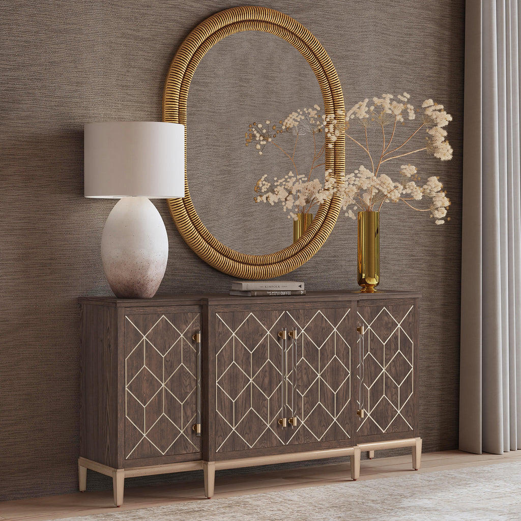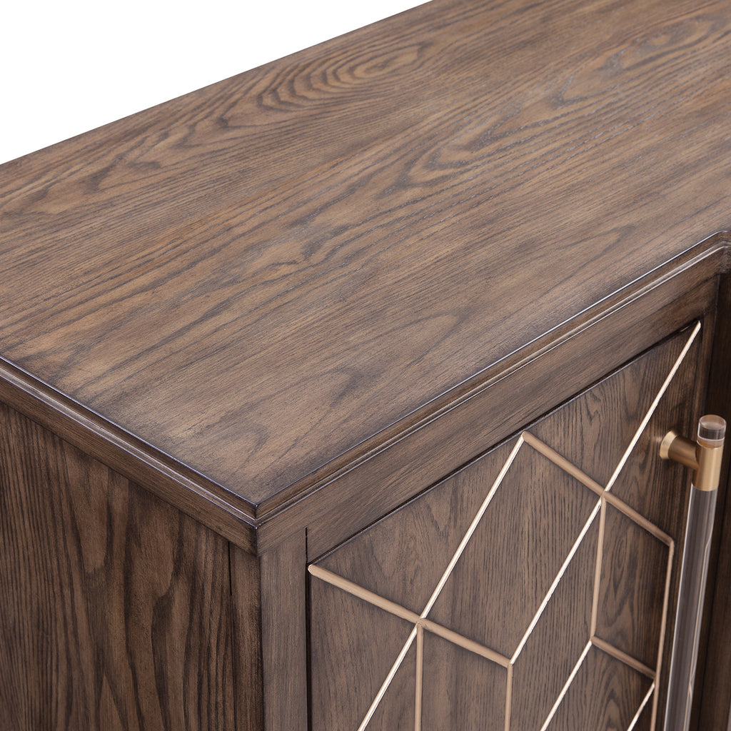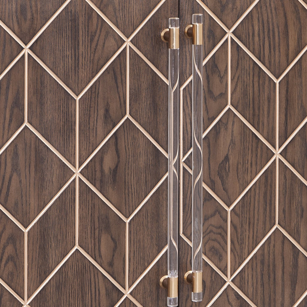 Perrine Brown Oak Server features modern glam design inspirations. The four doors feature a geometric carved design with a contrasting gold finish. The door pulls feature gold caps on the custom acrylic hardware. The case is constructed with rubberwood solids and oak veneers in a brown oak finish. The offset base features tapered legs in a contrasting gold finish. The interior features a drawer and three adjustable shelves with cutouts for media cord management.