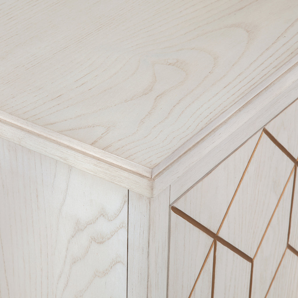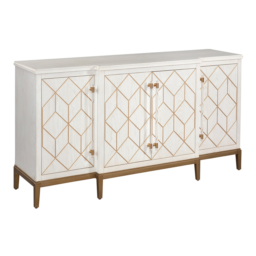 Meet the Perrine White Server, a fine example of modern glam design. With its four doors featuring a geometric carved design highlighted by a gold finish, it showcases a blend of artistry and functionality. Inside, you'll discover two shelves behind each door, and the center provides a convenient drawer and shelf. The soft white finish, satin brass accents, and clear acrylic elements make it a distinctive addition to your home. The Perrine White Server combines style and practicality to enhance your decor.