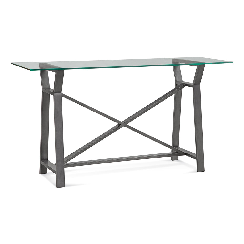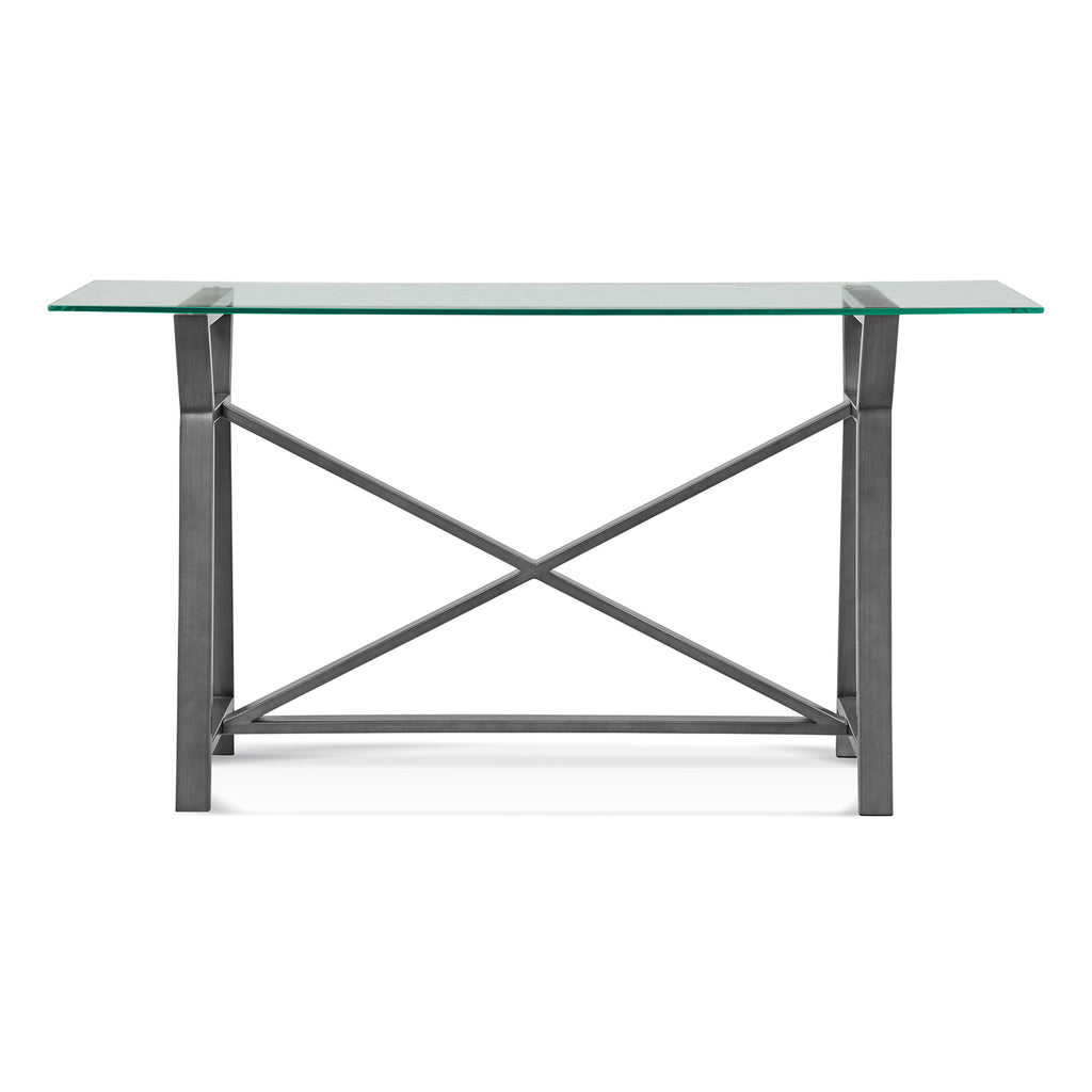 The Ross Console Table features a metal X cross base design. Finish: hand-brushed pewter. Material: powder coated steel, clear glass. Adjustable floor levelers.
