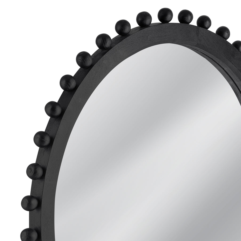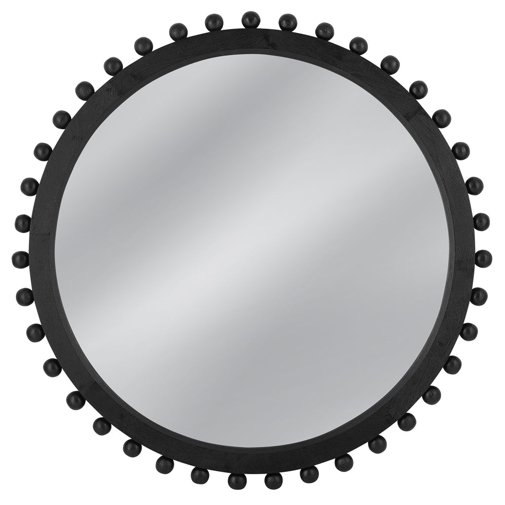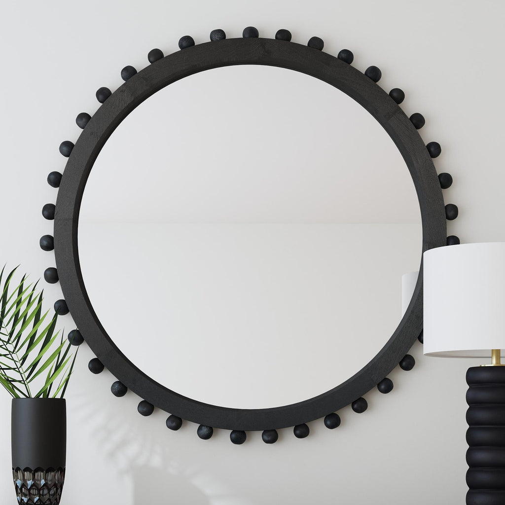 The Round Renn Wall Mirror boasts a sleek matte black finish, blending traditional charm with modern flair. Its classic round shape is accented by contemporary knob detailing, adding a touch of sophistication to any space. With its versatile design, this mirror effortlessly complements a variety of decor styles, from minimalist to eclectic. Crafted with quality materials and attention to detail, it exudes timeless elegance and durability.