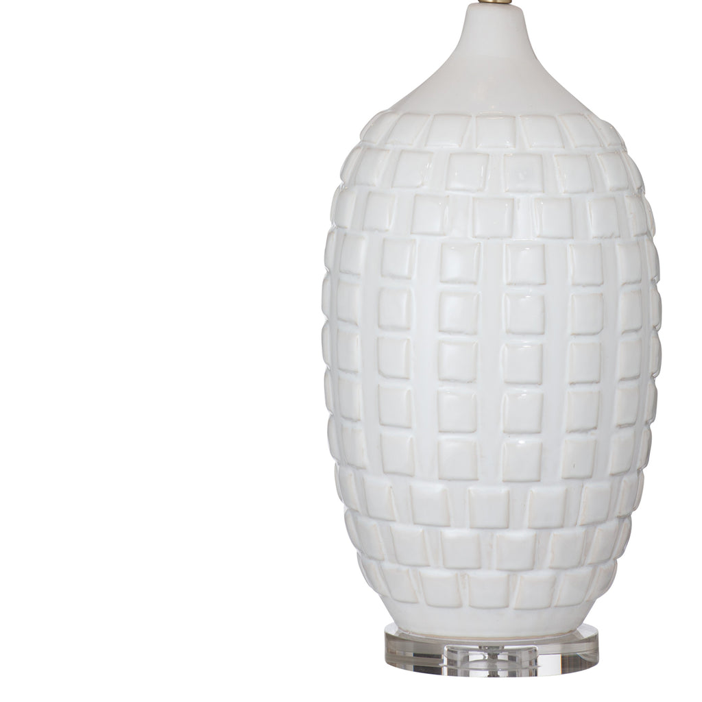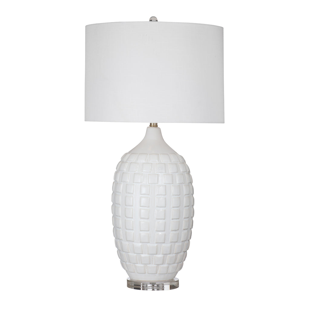 The Sesser Table Lamp features a sleek white ceramic base with a square stamped pattern, adding a stylish touch to any space. The contemporary design is complemented by an acrylic support base that provides stability while enhancing the lamp's modern appeal. The white drum shade softens the light, creating a warm and inviting atmosphere perfect for living rooms, bedrooms, or offices. With its clean lines and elegant details, the Sesser Table Lamp seamlessly fits into a variety of interior styles, bringing both form and function to your home.