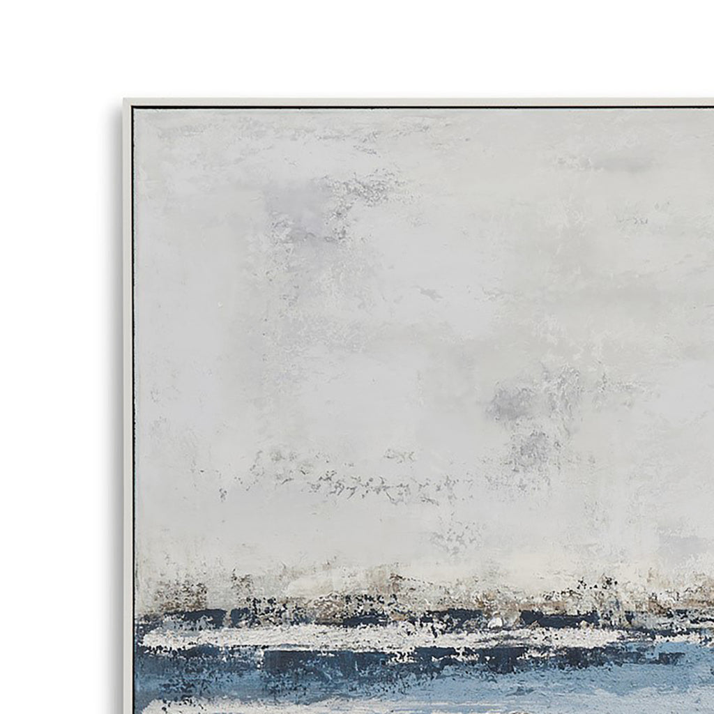 Soft Waves embodies serenity in an acrylic-painted canvas adorned with silver metallic paint accents, elegantly framed in white.