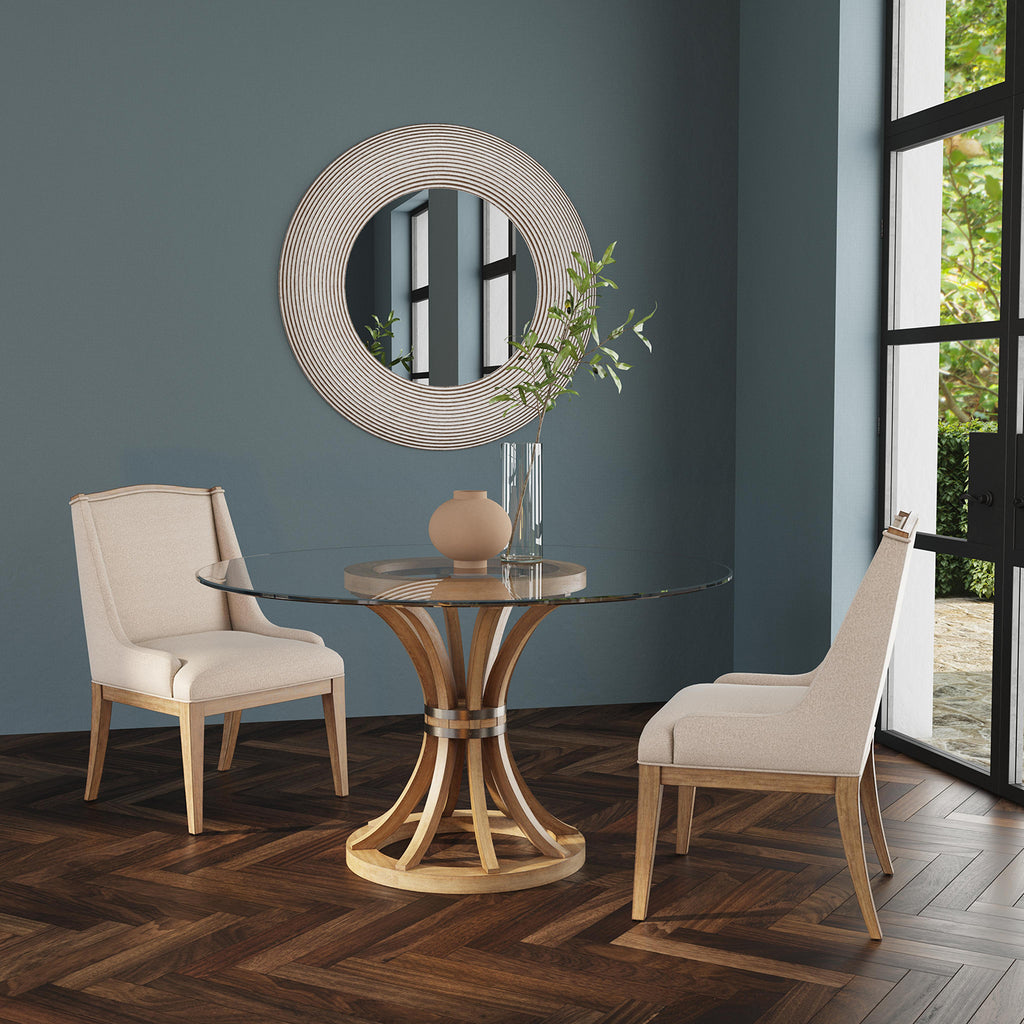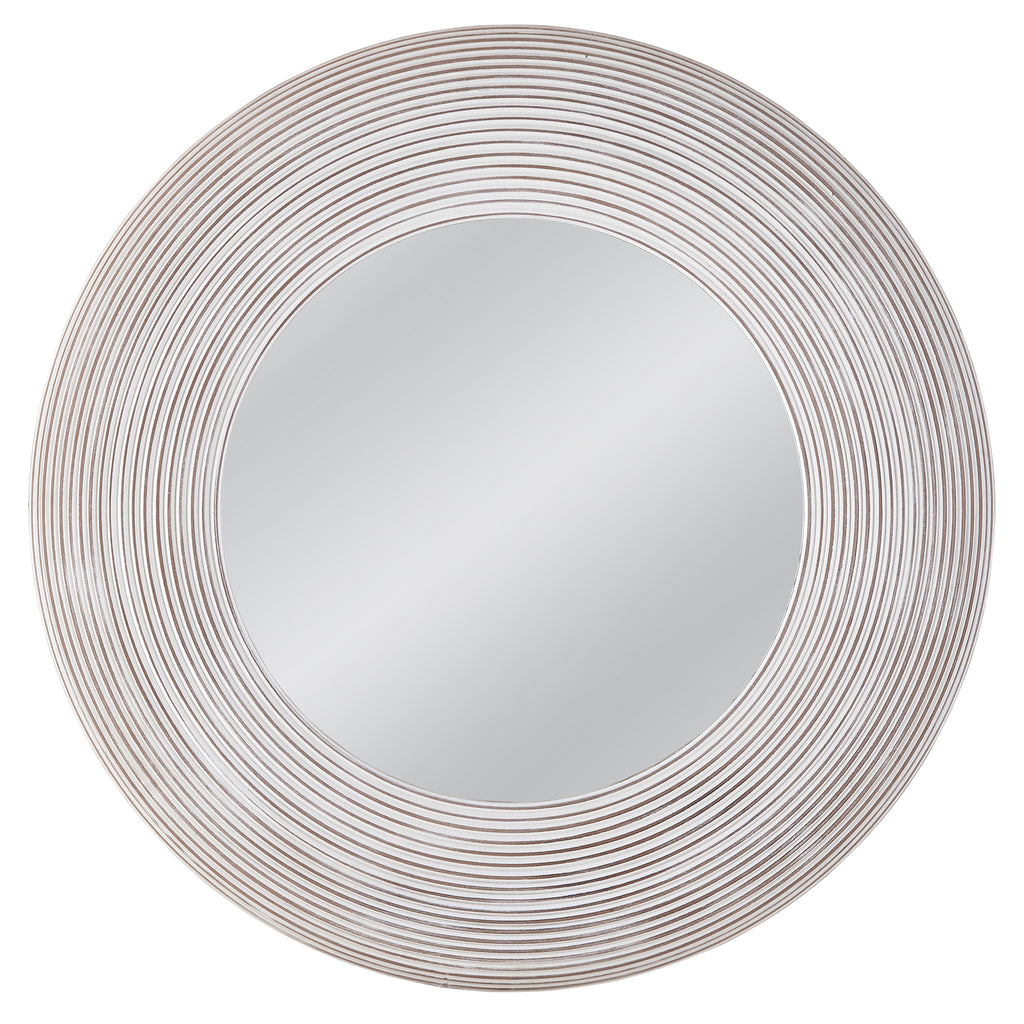 Spin Wall Mirror is a round decorative wall mirror. The wood mirror frame features a white wash finish. Includes two "D" ring attachment points for ease of access for hanging.