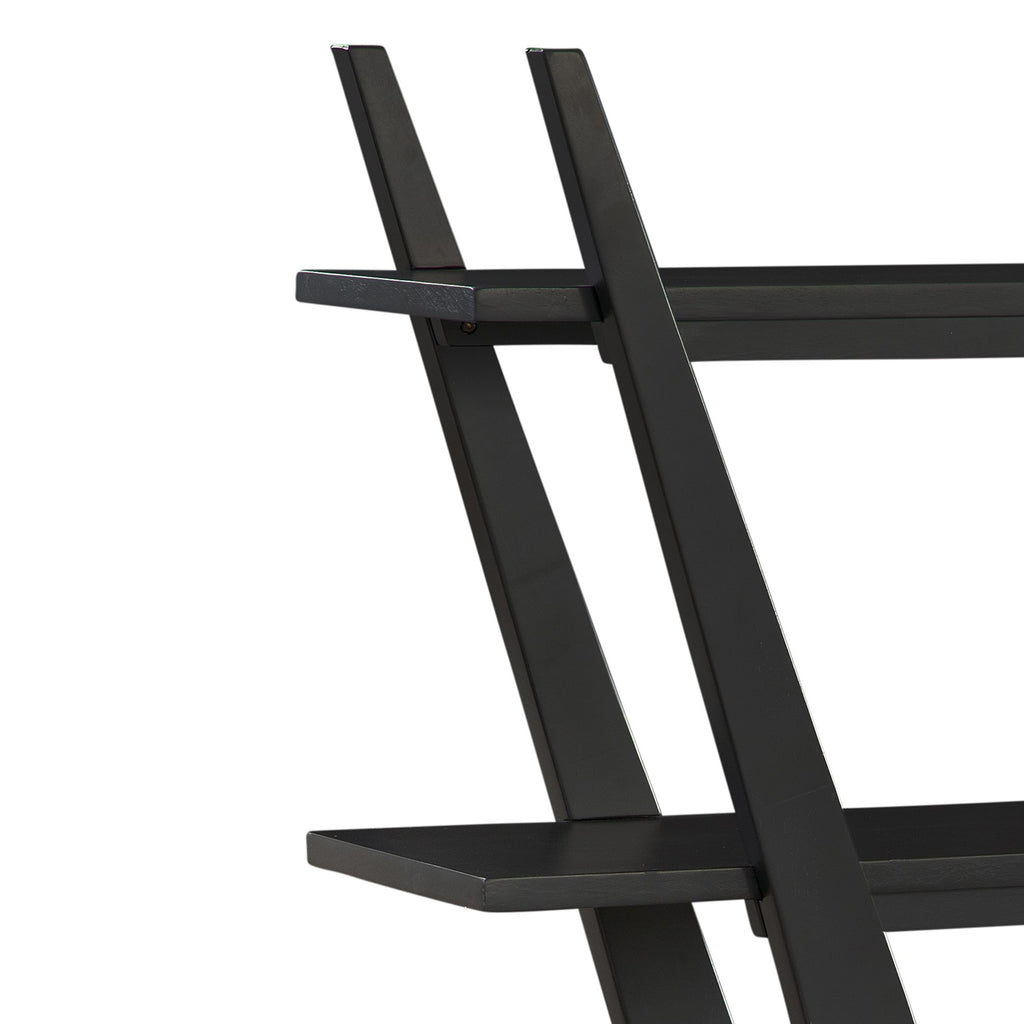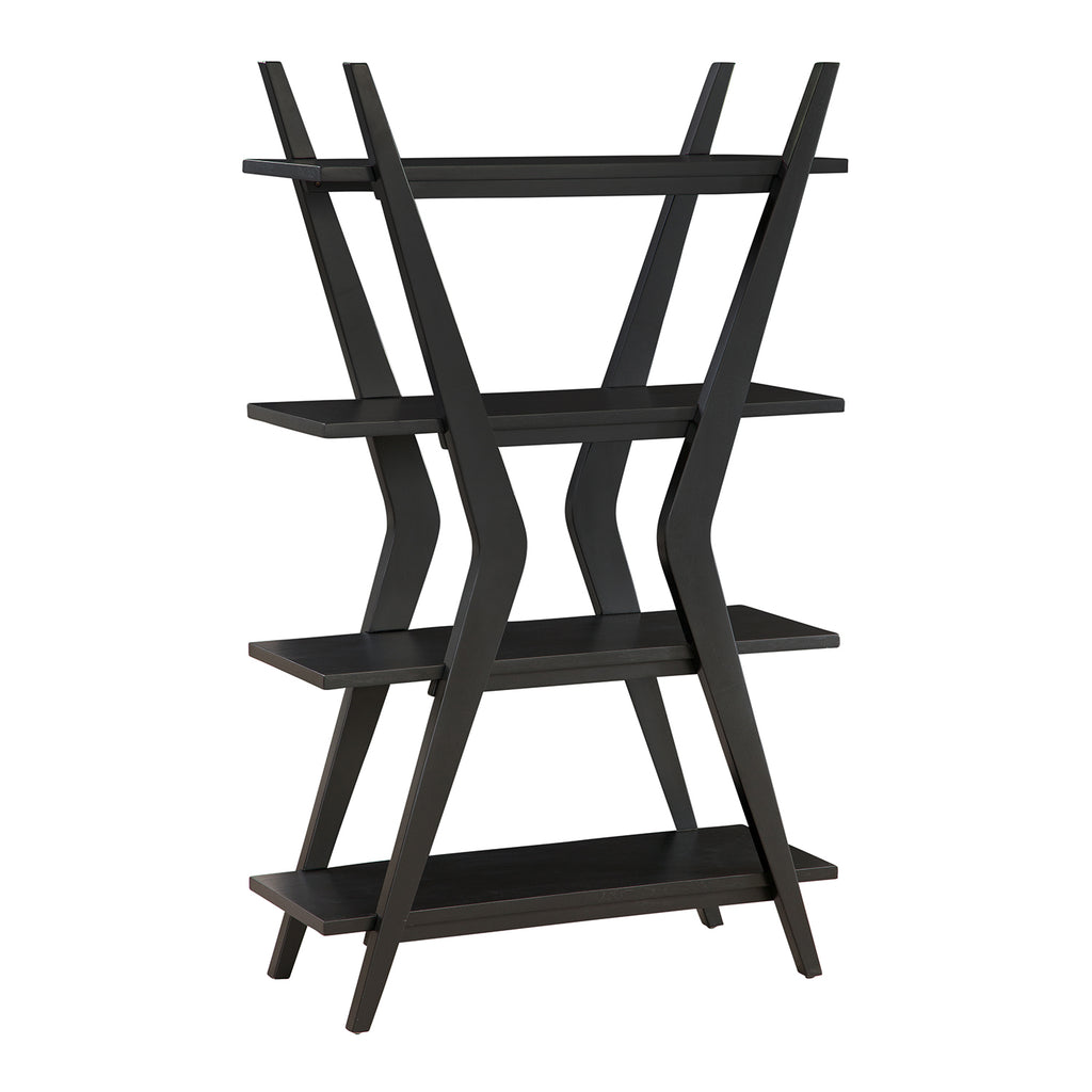 The Stratton Etagere features a Mid-century modern influenced design constructed with rubberwood solids and birch veneers in a matte black finish. The architectural inspired silhouette features an angled frame and four shelves for storage.