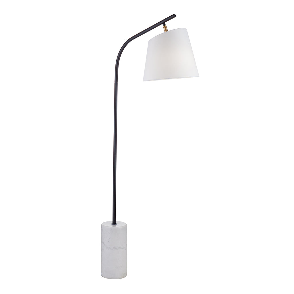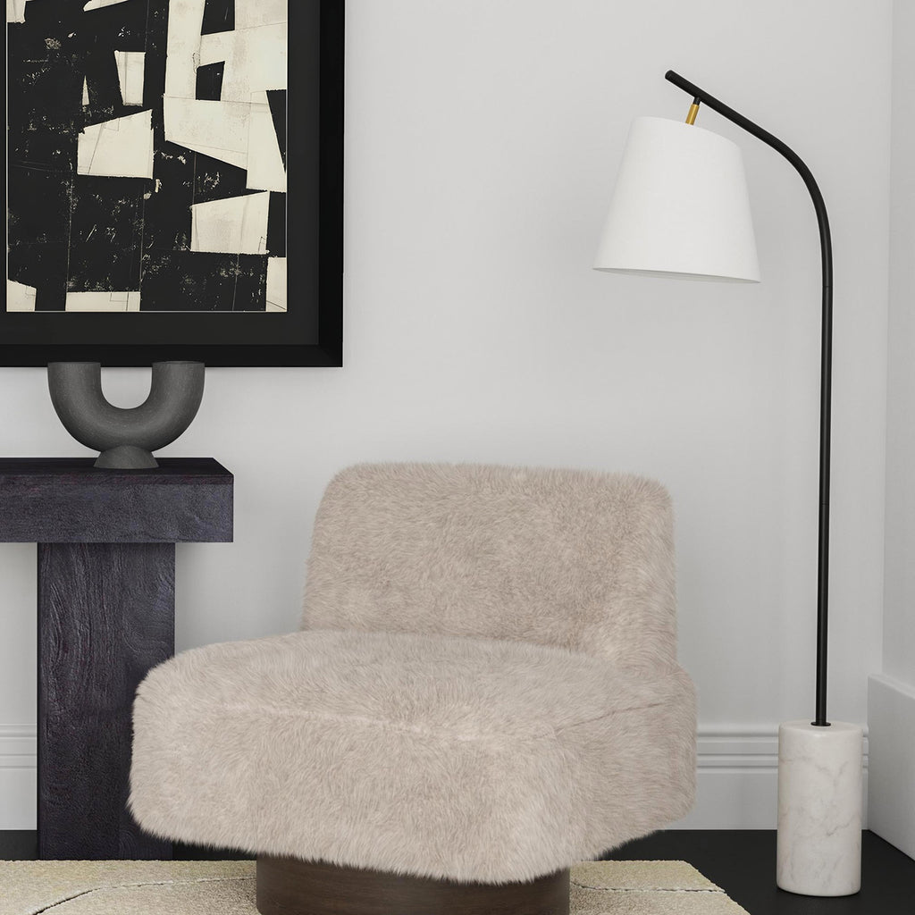 The Studio Floor Lamp showcases impeccable craftsmanship, constructed from durable metal with a sleek black finish and anchored by a luxurious white marble base. Its contemporary design is highlighted by a crisp white linen drum shade, adding a touch of elegance to its modern aesthetic.