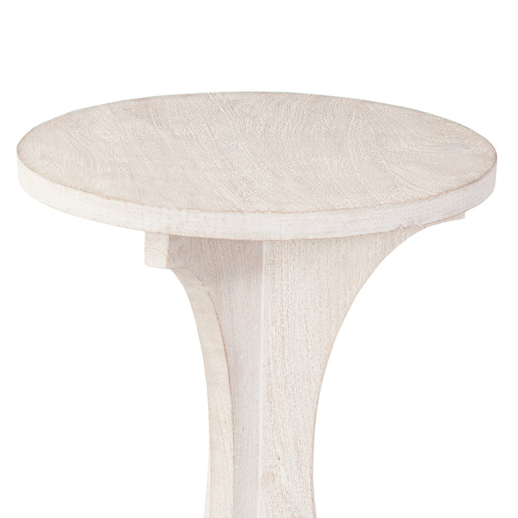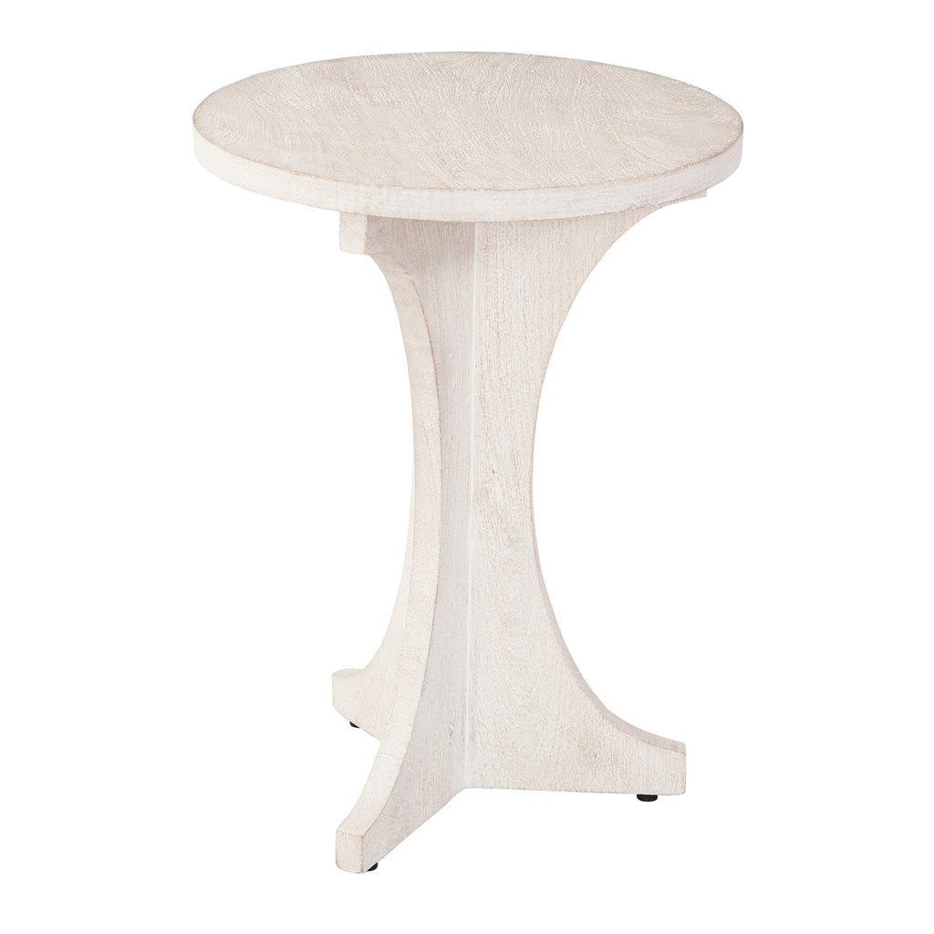 The Tait Accent Table has a boho, coastal design style. The solid mango wood table features a sandblasted finish, adding texture to the white-washed color.
