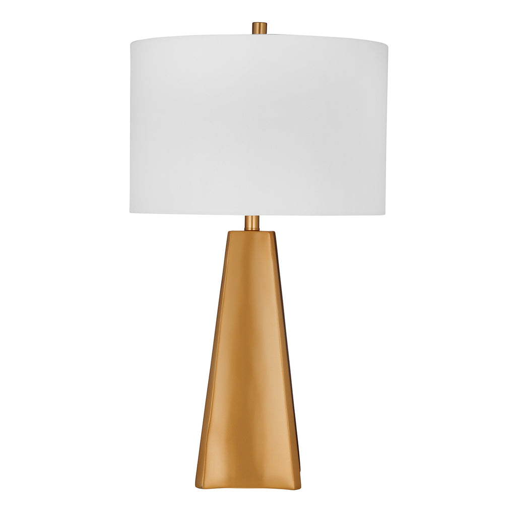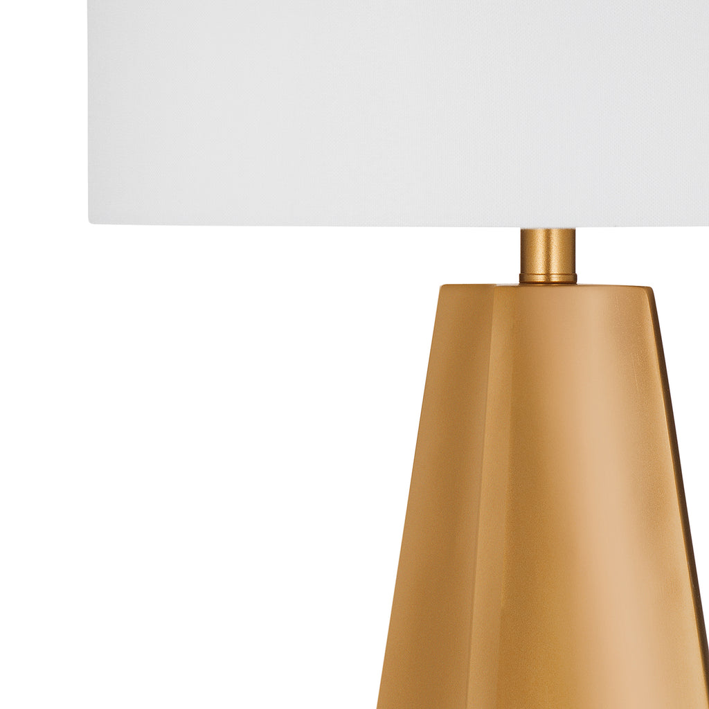The Torrington Table Lamp is a striking piece featuring a sleek, conical shaped body that tapers elegantly towards the base. Its lustrous gold finish adds a rich, luxurious appeal to the lamp, making it a standout accessory that catches the eye. The design is both modern and glamorous, and is perfectly topped off with a crisp, white cylindrical lamp shade that balances the boldness of the base with a soft, diffuse lighting effect. This lamp would serve as a sophisticated accent in a contemporary space, infusing it with a warm, opulent glow.