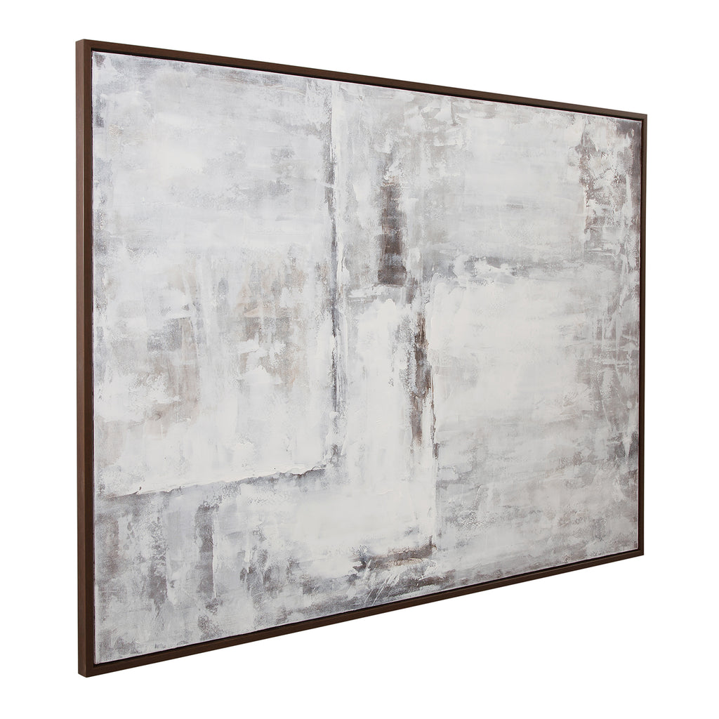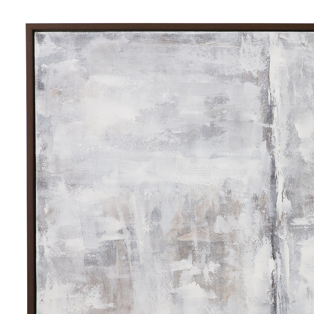 The Triad Framed Canvas exudes contemporary minimalism with its cool tone color palette and abstract artwork. Wrapped in a sleek black frame for visual appeal.