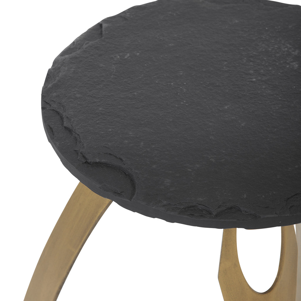 The Vaughan Accent Table displays a modern styling, architectural inspired solid iron base in an antique brass finish, sandblasted black slate top with natural edges.