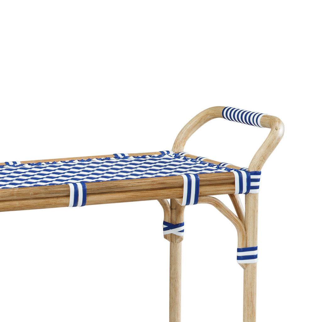 The Ventana Bar Cart has coastal styling with bistro inspiration. Features a top and bottom shelf for storage, and and casters on the legs for function. Finished in tan, blue and white rattan.