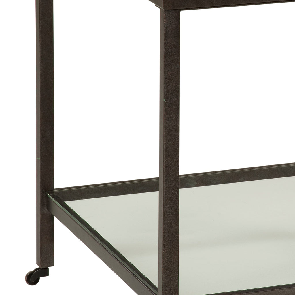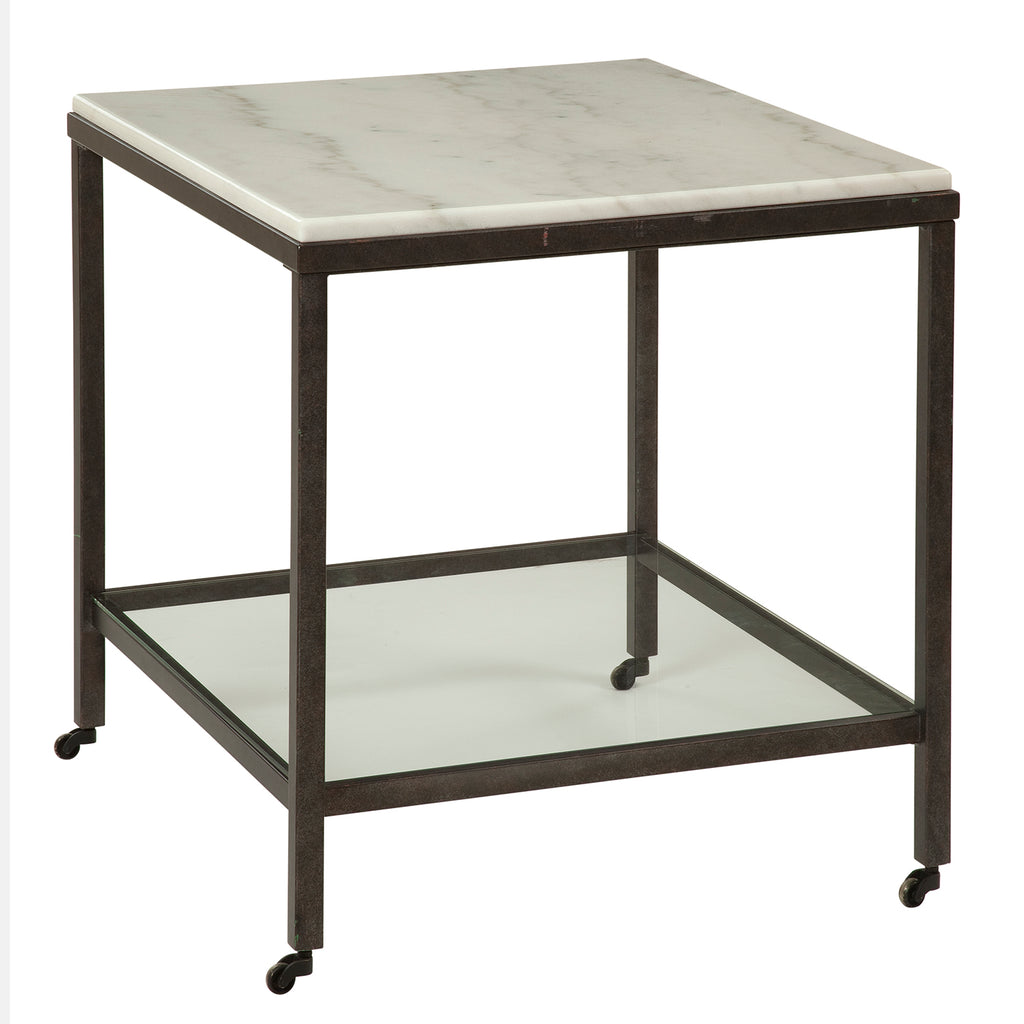 The Whitman Square End Table features a striking contrast between bronze and ivory marble. The solid stone tops rests on a steel base and features piano casters for added functionality. This square end table is accented with a clear glass shelf for extra storage.
