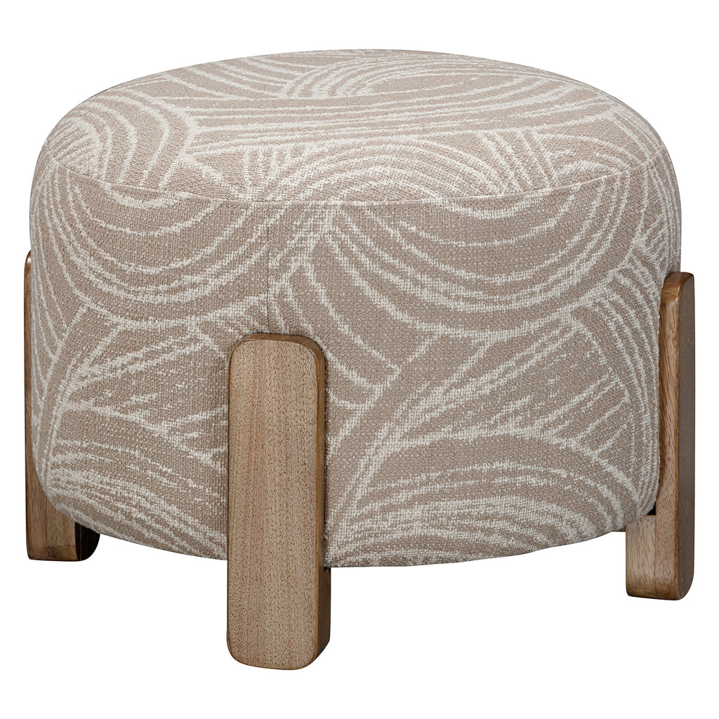 The Willow Accent Ottoman exudes a delicate blend of modern charm and traditional warmth, making it an inviting addition to any space. Its soft khaki swirl fabric wraps around plush padding, creating a cozy retreat for tired feet or an elegant seat for guests. The exposed wood base in a natural mango finish adds a touch of organic beauty, grounding the piece in natural elements while offering durability. Perfectly suited for multifunctional use, this ottoman seamlessly transitions between a stylish footrest and a comfortable stool, making it a versatile and timeless piece in any room.