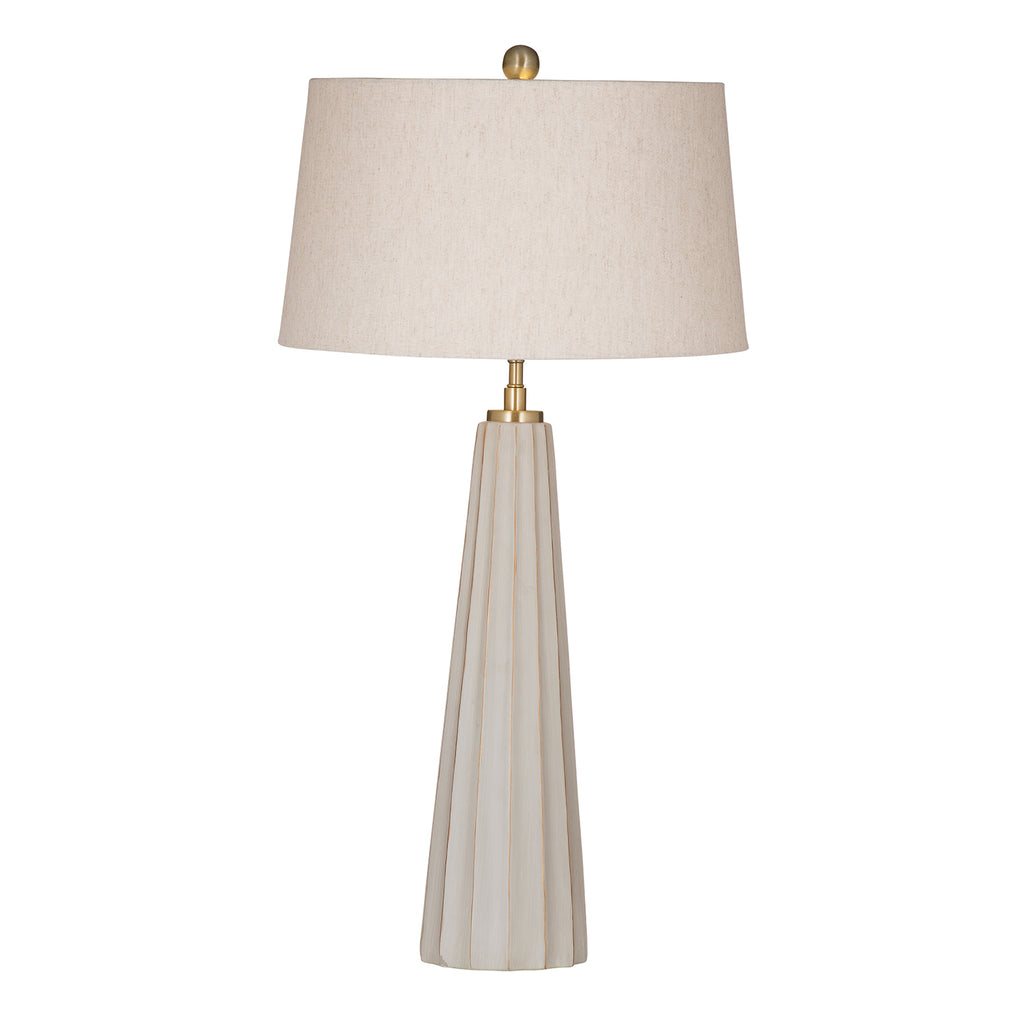 The Wythe Table Lamp, featuring a beige ridged cement body, embodies farmhouse rustic elegance. Its tapered drum-shaped shade, crafted with beige linen, complements the lamp's rustic charm. With a 60-inch cord, easy placement in your space is assured.