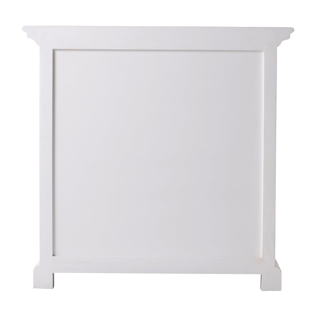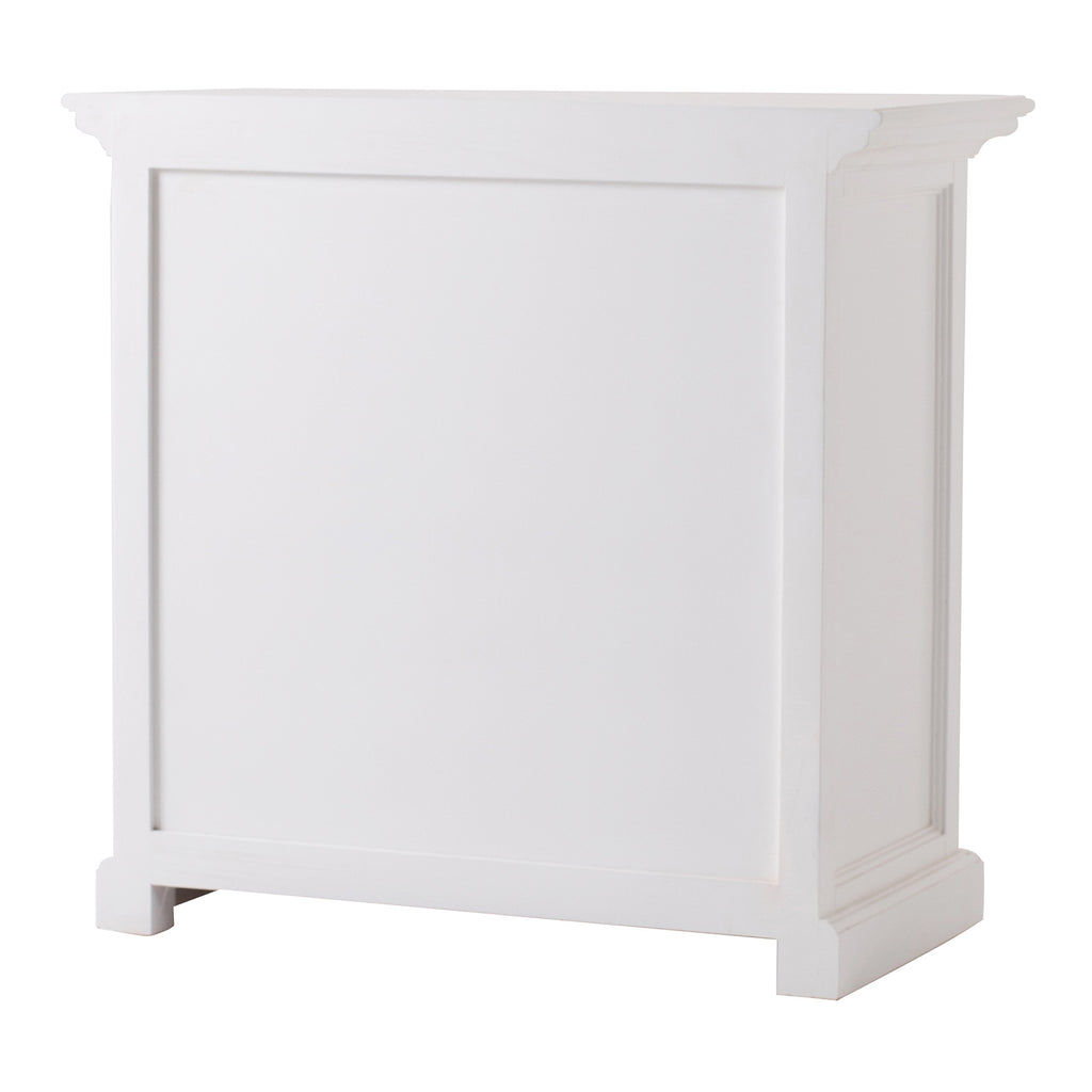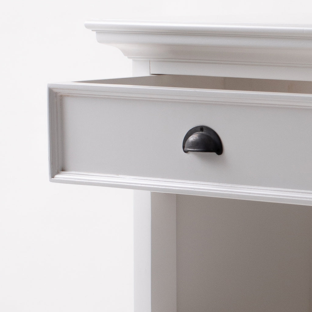 Beckton Grand introduces a limited collection of the classic white furniture, that has been scaled up in size. Like its parent collection, its designs combine the quaint charm of the French Countryside with the coastal flair of the Eastern Seaboard. Detailed profiling on each piece, together with the warm finishing and antique brass hardware, provides a classic collection for the contemporary home. This is a perfect combination of storage and style. Crown moulding is a charming feature of this drawer and shelving bedside companion. Handcrafted of from kiln dried solid mahogany, and hardware fabricated in an antique brass finish.