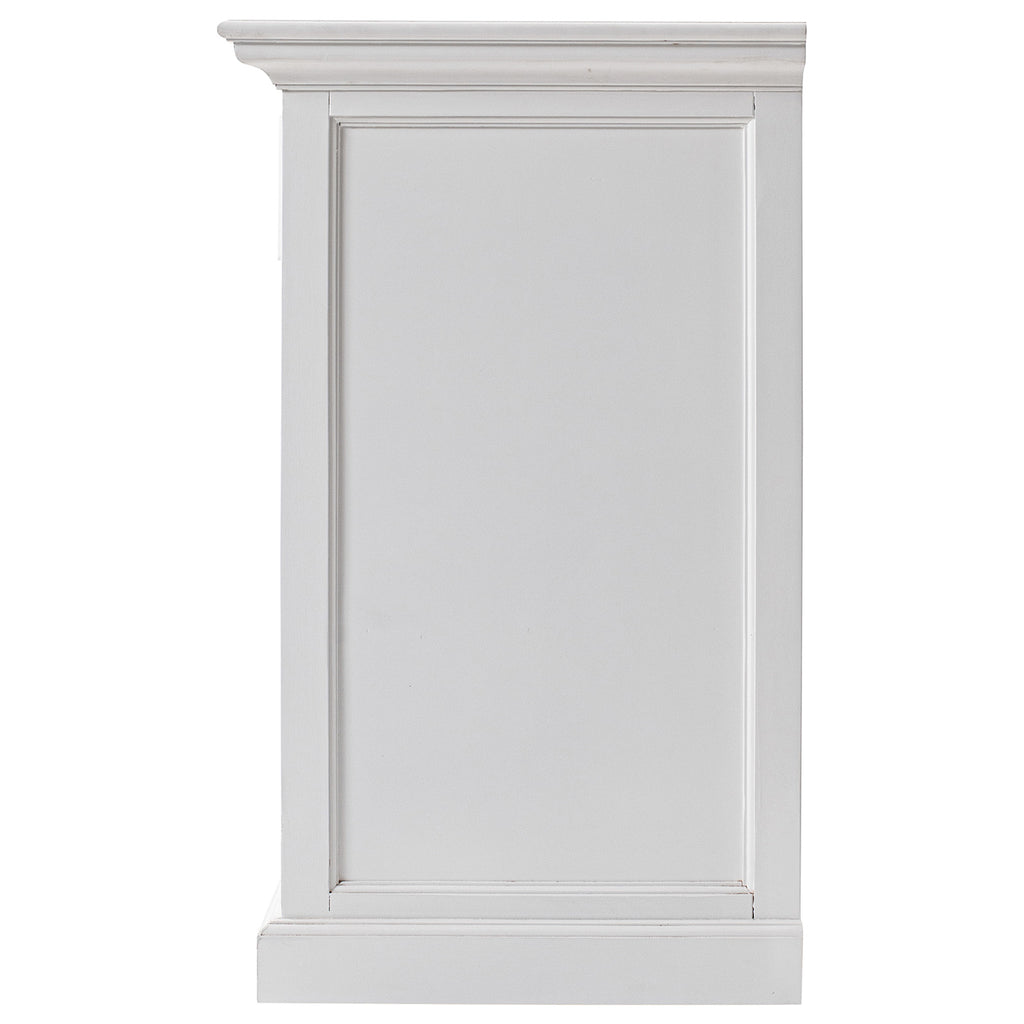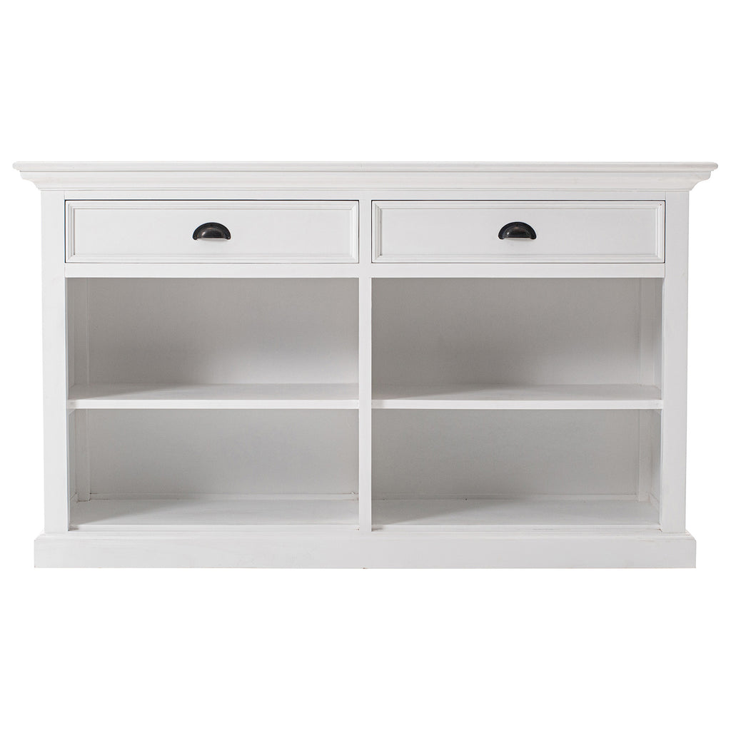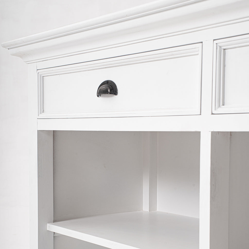 Beckton combines the quaint charm of the French Countryside with the coastal flair of the Eastern Seaboard to form a comprehensive range befitting the dining area, living space or bedroom. Detailed profiling on each piece, together with the warm finishing and antique brass hardware, provides a classic collection for the contemporary home. The generous proportions and farmhouse charm of this piece render it suitable for the kitchen and living space. Crown moulding and open shelving offer subtle styling. Utensils or linens can easily be housed in the drawers while fixed shelving provide ample storage.