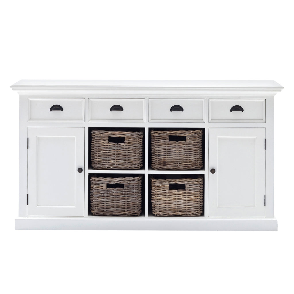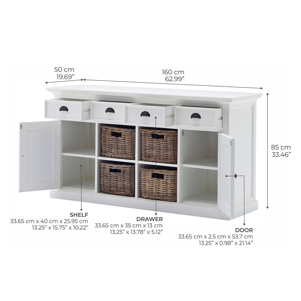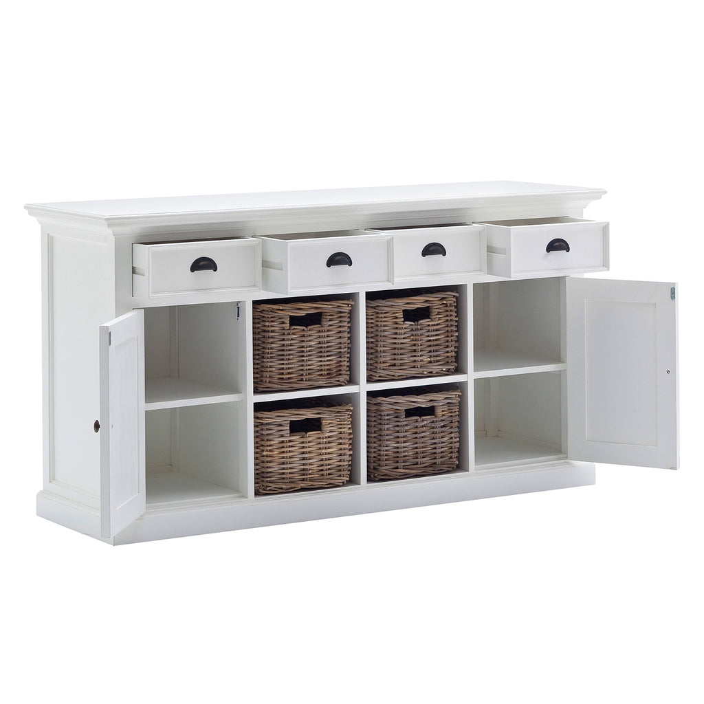 Beckton combines the quaint charm of the French Countryside with the coastal flair of the Eastern Seaboard to form a comprehensive range befitting the dining area, living space or bedroom. Detailed profiling on each piece, together with the warm finishing and antique brass hardware, provides a classic collection for the contemporary home.  Buffet or sideboard? You choose what to call it - but a storage showpiece like this almost needs no label. From dining room to home office, it’s a piece that translates into more spaces than one. Think table linens, placemats and cutlery in its hand-woven kubu rattan baskets – or maybe spare paper, stationery essentials and children’s coloring crayons. The fixed shelving behind shaker style doors offer additional storage.