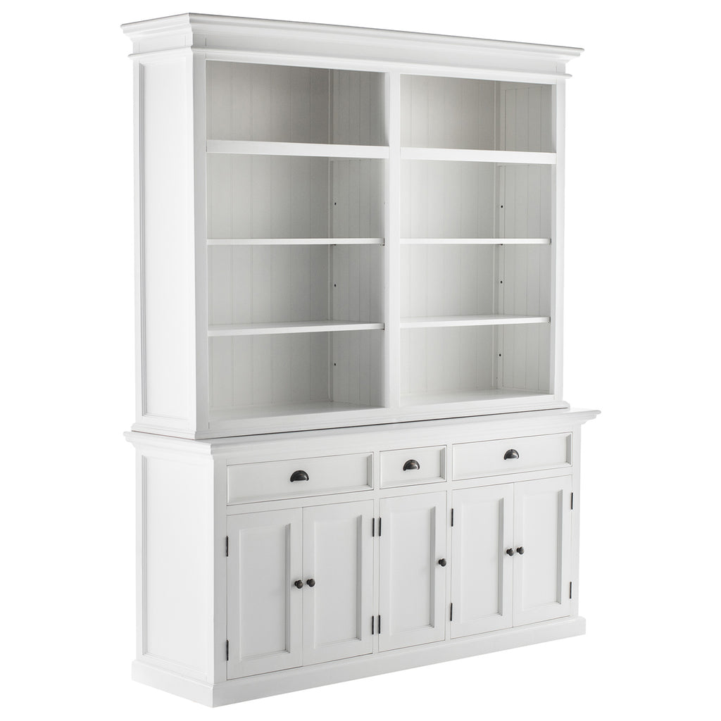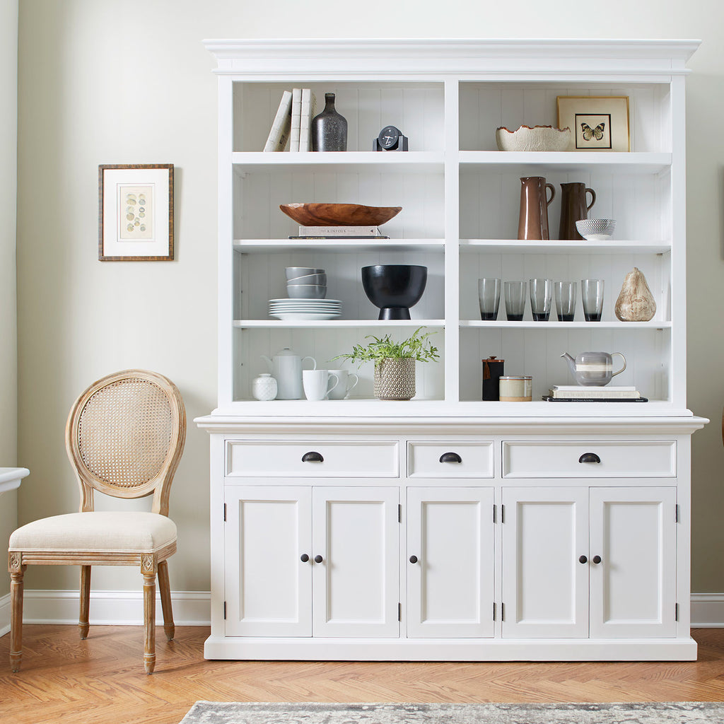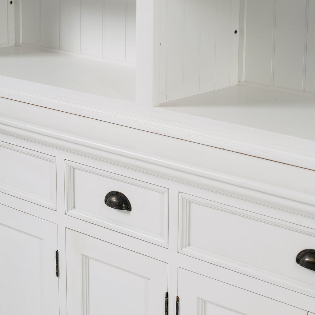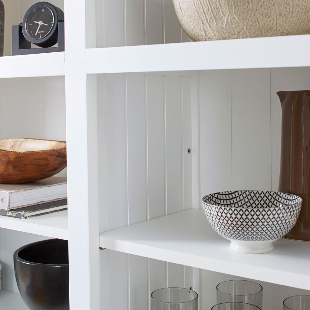 Beckton combines the quaint charm of the French Countryside with the coastal flair of the Eastern Seaboard to form a comprehensive range befitting the dining area, living space or bedroom. Detailed profiling on each piece, together with the warm finishing and antique brass hardware, provides a classic collection for the contemporary home. This generously proportioned and versatile bookcase unit can find its home in your living room or bedroom. Two separate components working together to create ideal storage. The base unit, with its combination of drawers and deep shelving, can be home to personal items or linens. The upper shelving unit features detailed beadboard wainscotting, that acts as an attractive backdrop for books or collectibles.
