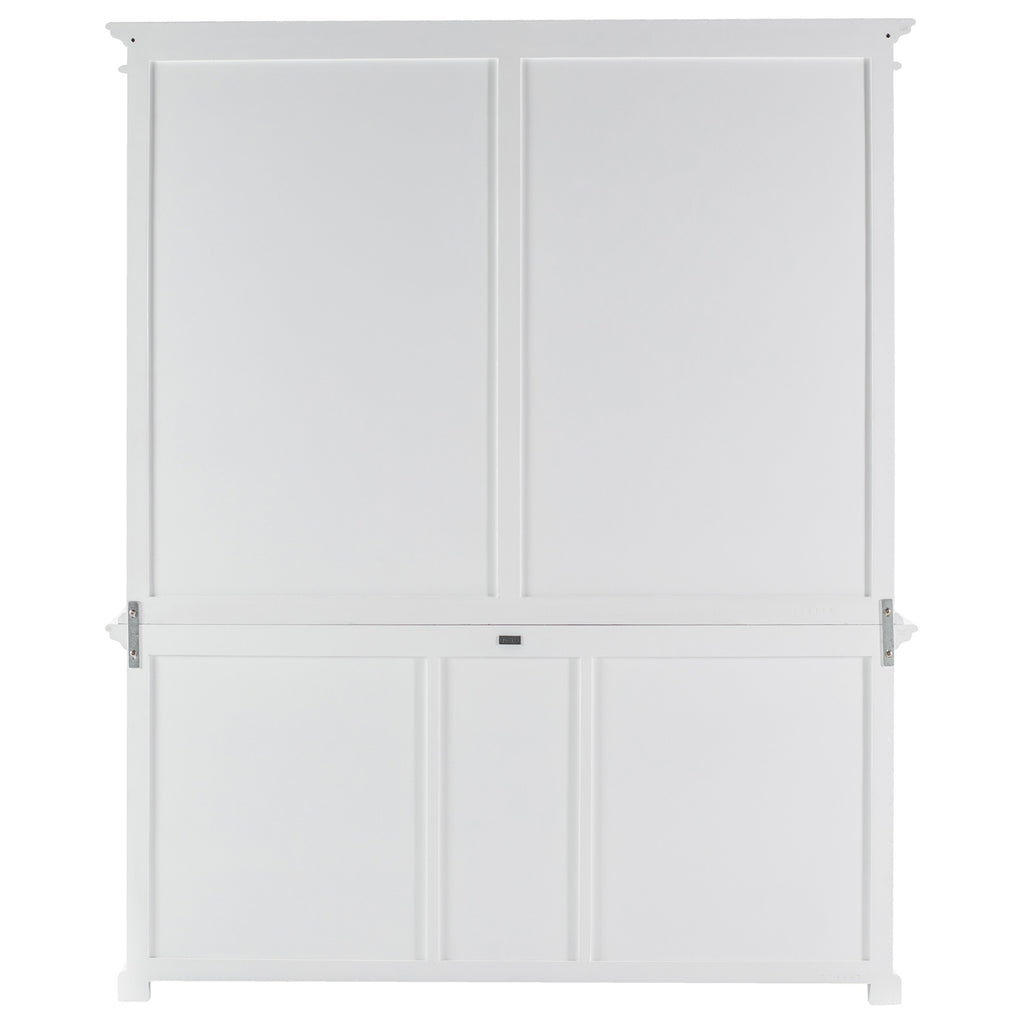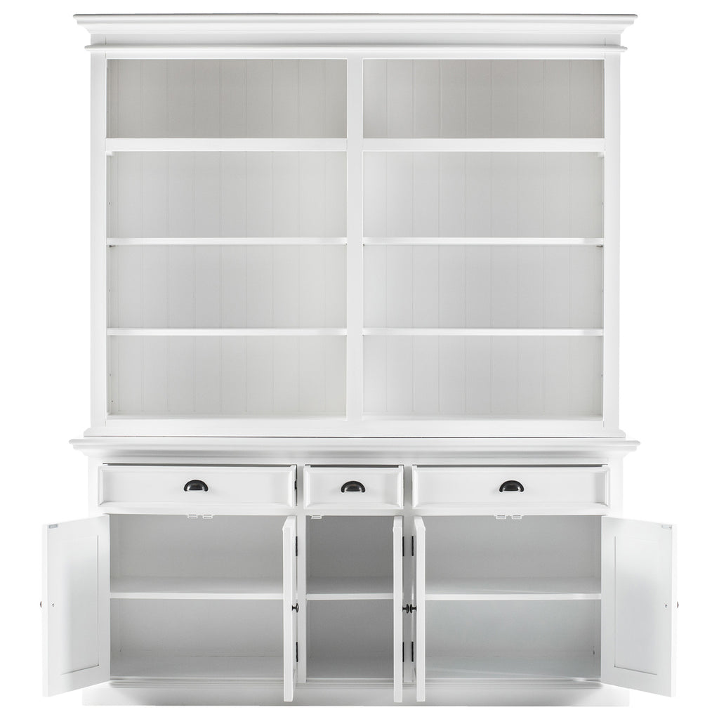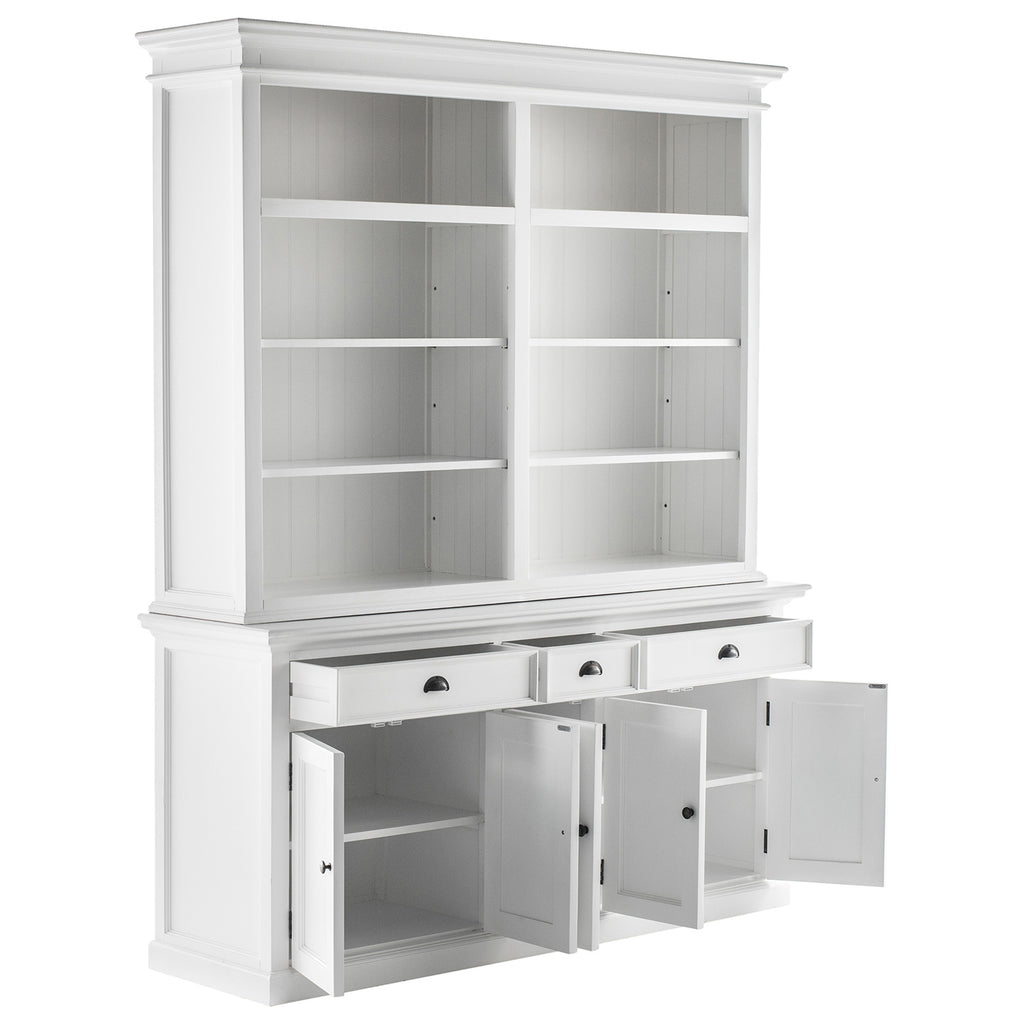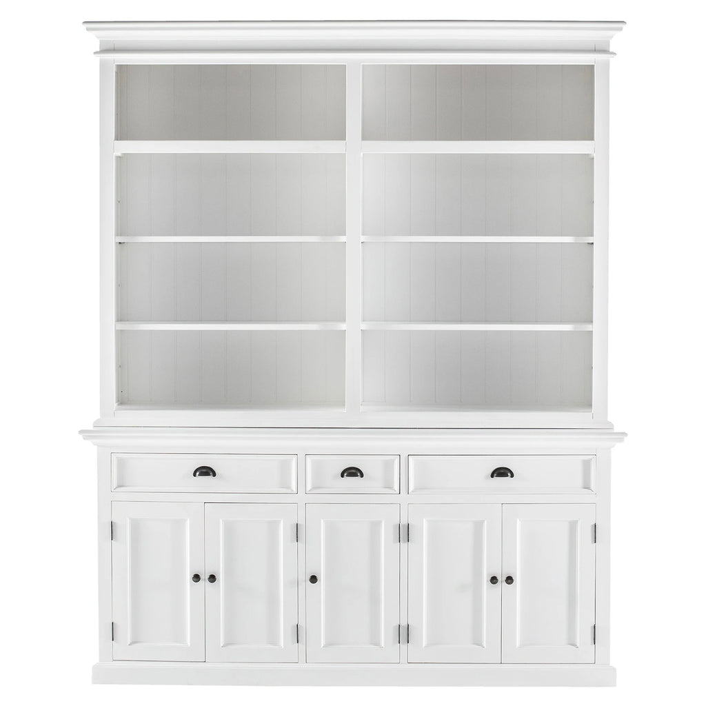 Beckton combines the quaint charm of the French Countryside with the coastal flair of the Eastern Seaboard to form a comprehensive range befitting the dining area, living space or bedroom. Detailed profiling on each piece, together with the warm finishing and antique brass hardware, provides a classic collection for the contemporary home. This generously proportioned and versatile bookcase unit can find its home in your living room or bedroom. Two separate components working together to create ideal storage. The base unit, with its combination of drawers and deep shelving, can be home to personal items or linens. The upper shelving unit features detailed beadboard wainscotting, that acts as an attractive backdrop for books or collectibles.