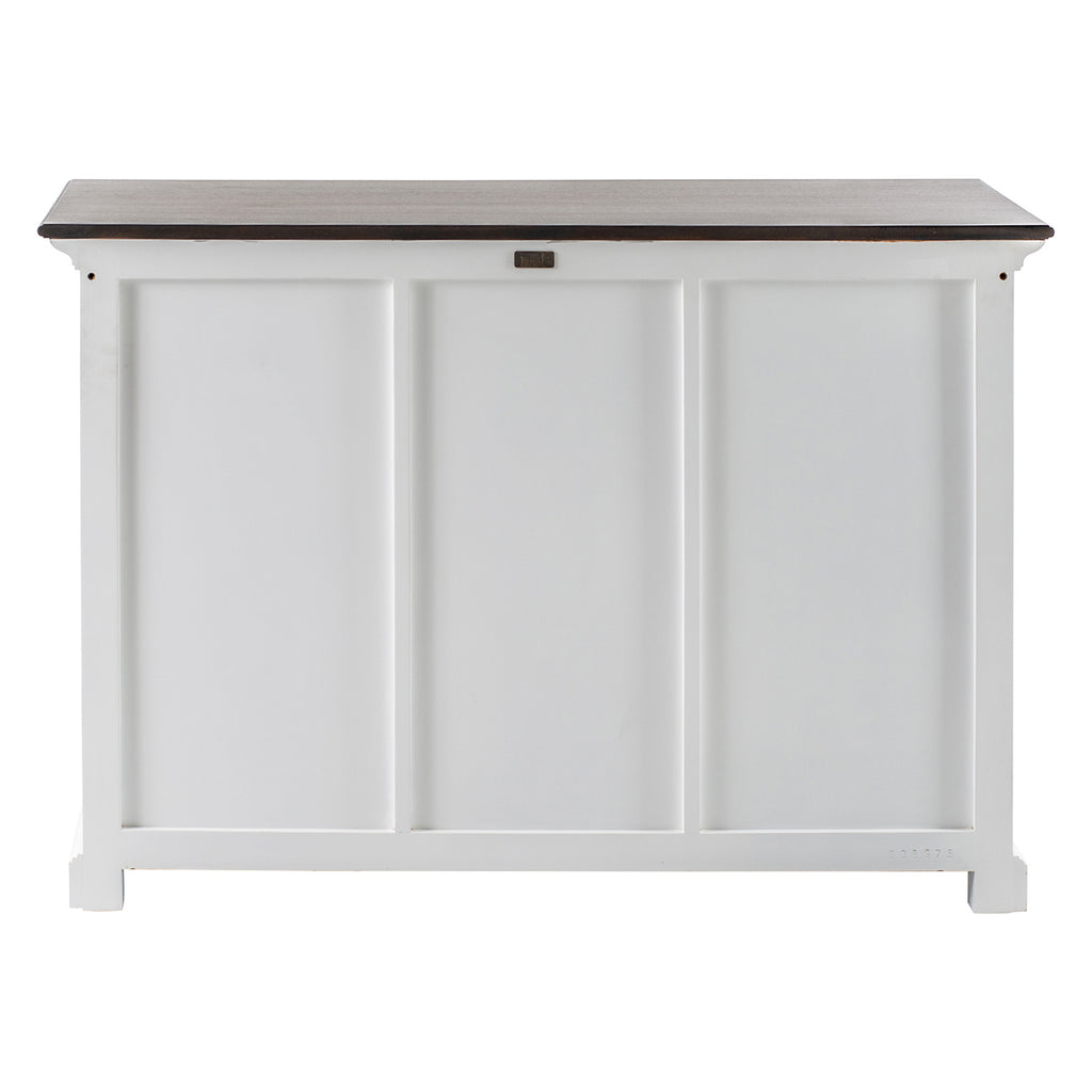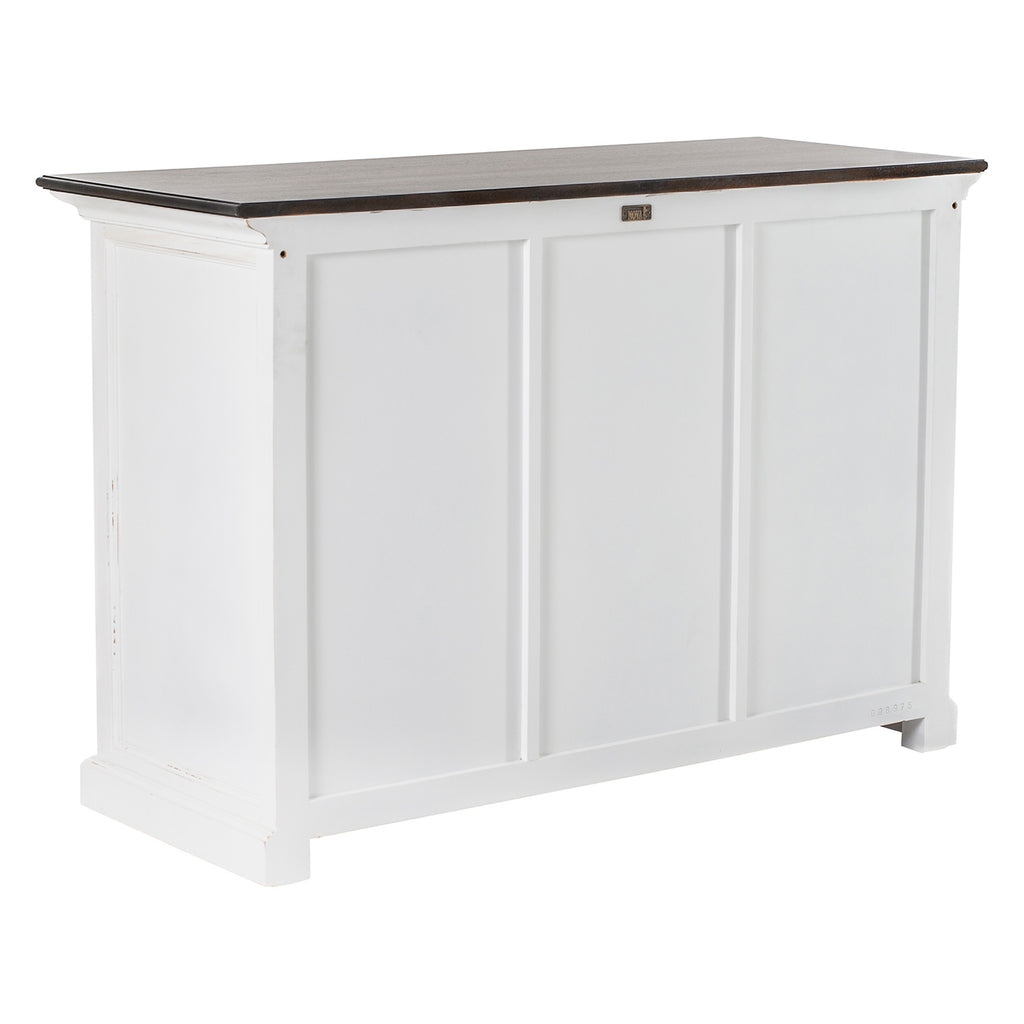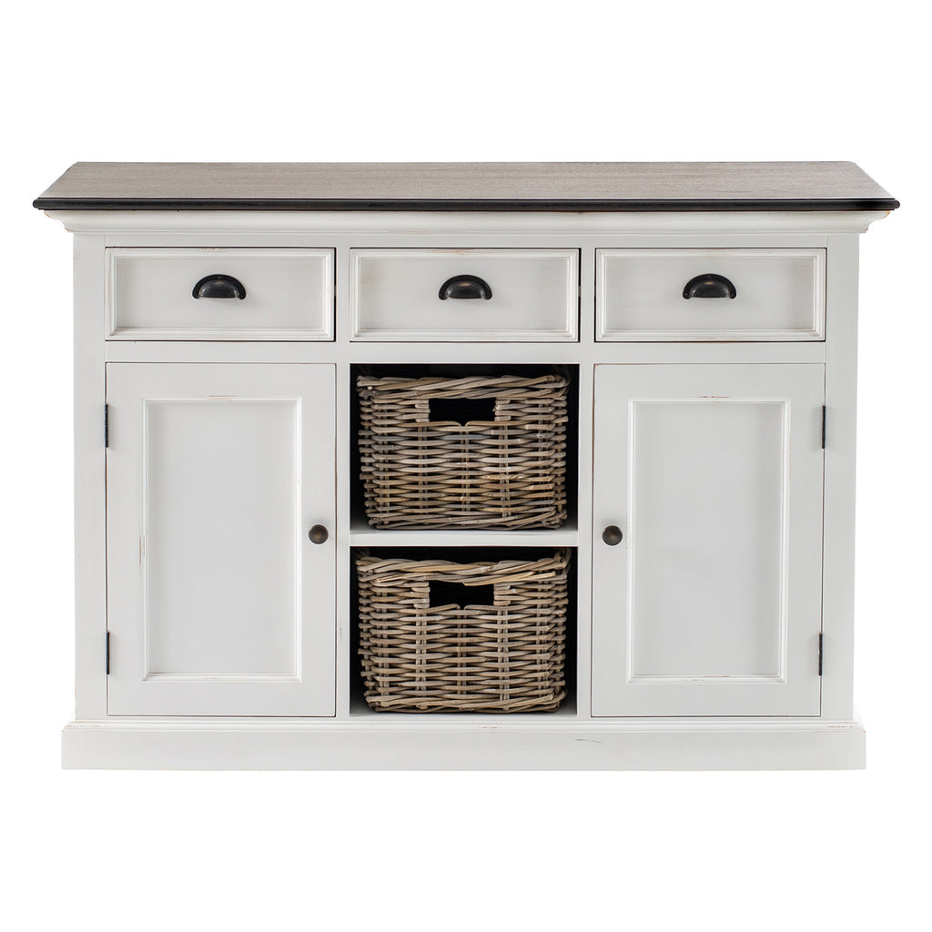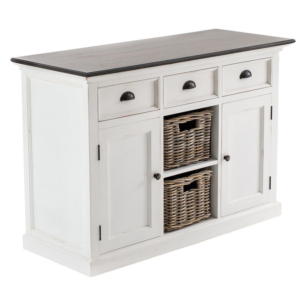 Working the exact same design credentials as its partner collections – a solid mahogany frame and meticulous traditional detailing to name two – with exposed its wooden top surface and treated it with a deep and dark wood stain that bounces the light. Also features distressed paintwork slightly so it channels a wonderful pre-loved vibe. This variation on the classic buffet offers clever storage versatility with its combination of generous drawers, hand-woven baskets and fixed shelving behind shaker style doors. It's the ideal piece for the living or dining room, housing linens, housewares, or wine glasses. Exposed wooden top surface treated with a deep and dark wood stain that bounces the light. Features slightly distressed paintwork so it channels a wonderful pre-loved vibe.