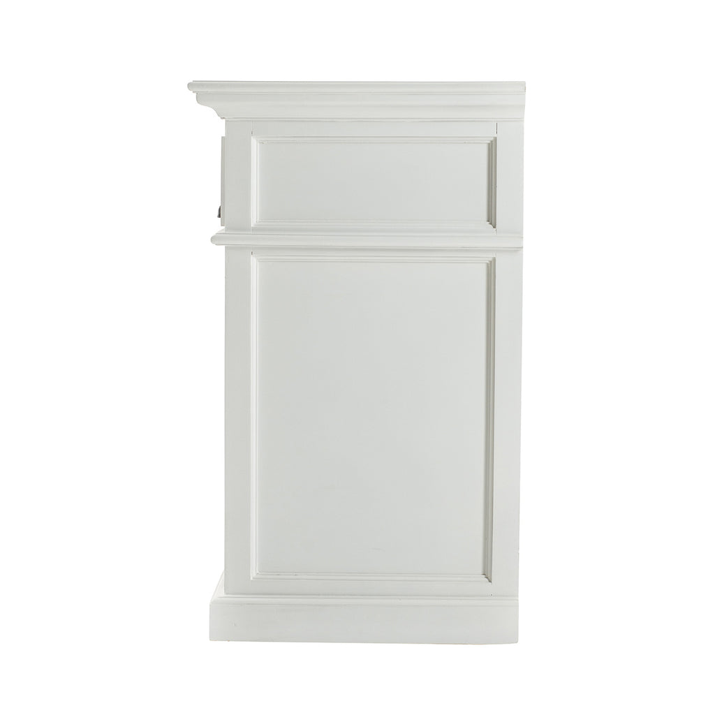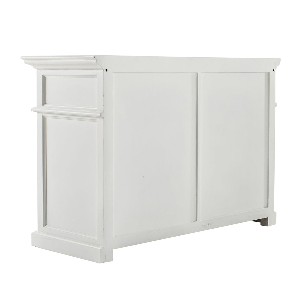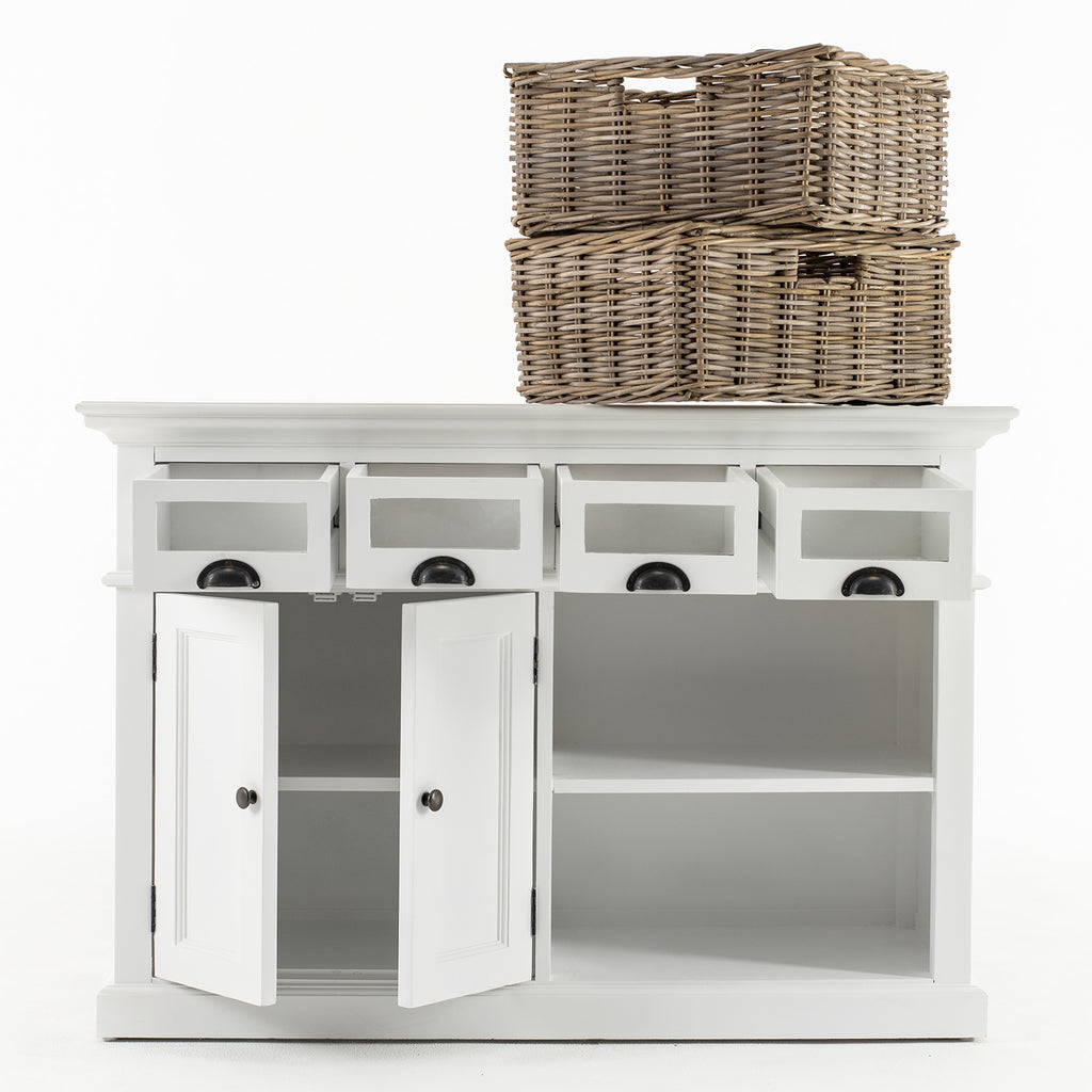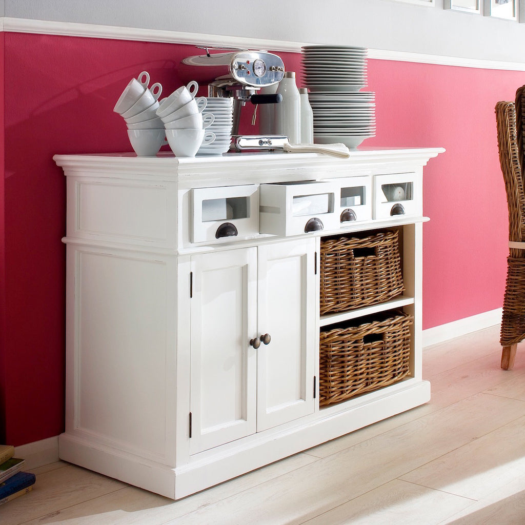 Beckton combines the quaint charm of the French Countryside with the coastal flair of the Eastern Seaboard to form a comprehensive range befitting the dining area, living space or bedroom. Detailed profiling on each piece, together with the warm finishing and antique brass hardware, provides a classic collection for the contemporary home. Storage versatility and rustic farmhouse appeal are charmingly presented in our kitchen buffet. Glass-fronted drawers provide a window to the contents, and are ideally suited for all your kitchen flatware and utensils. Two generous handwoven kubu rattan baskets are perfect for linens, dry goods or large utensils. Fixed shelving, hidden behind the shaker style doors, can easily house any of your dining needs.