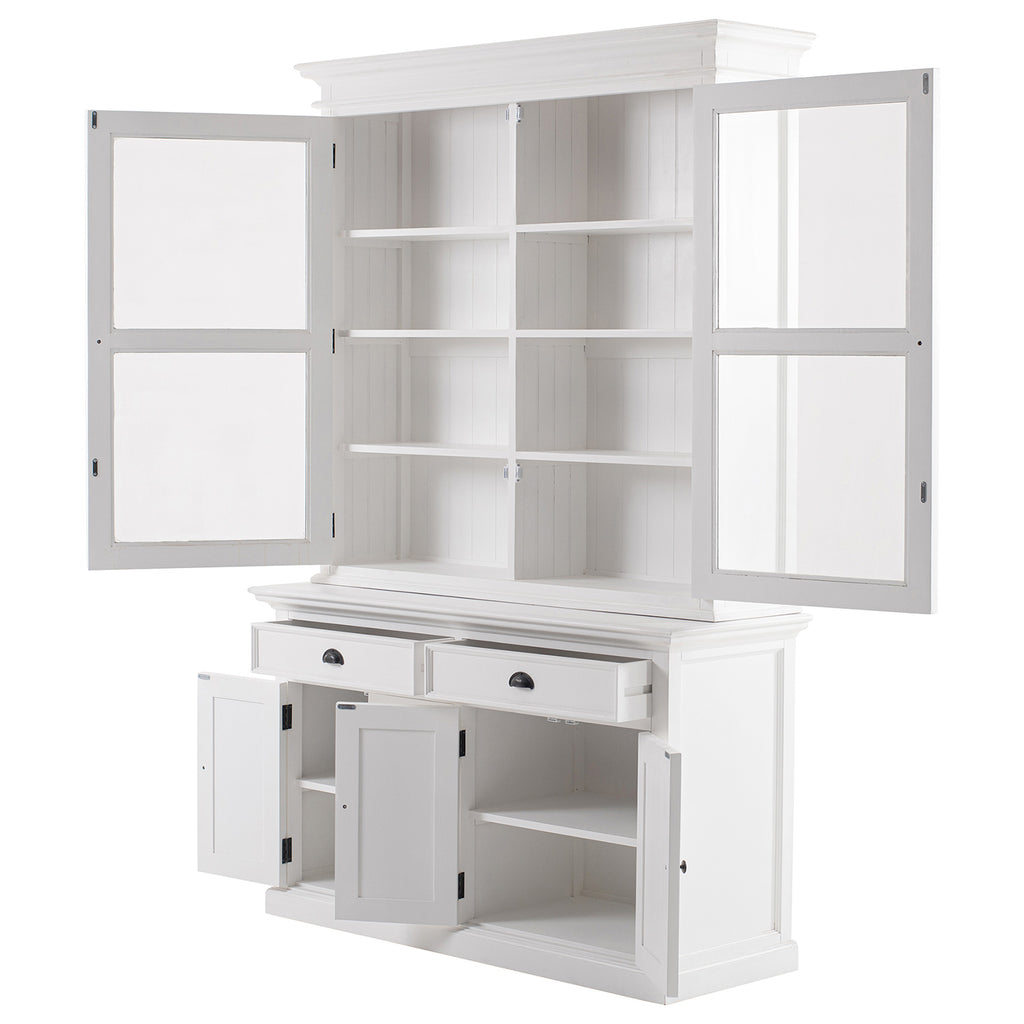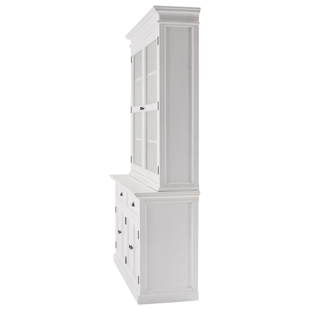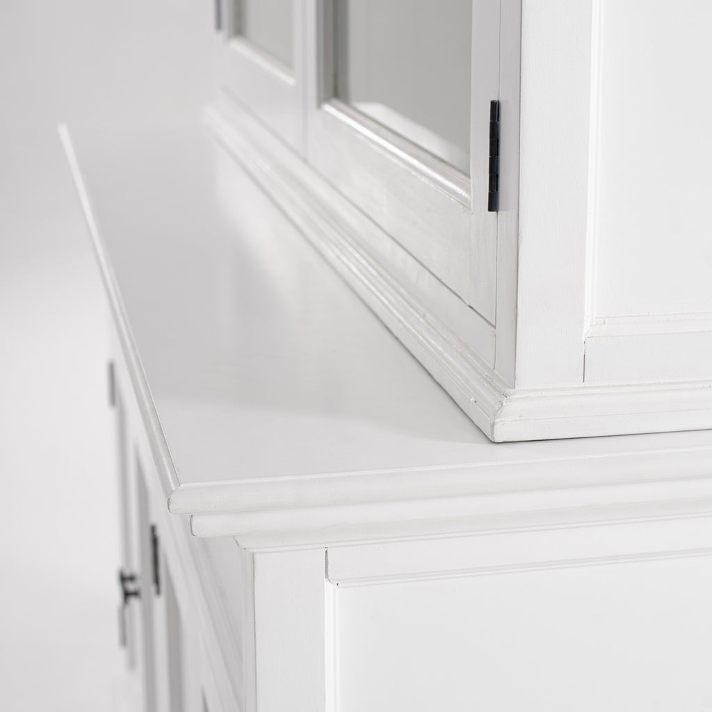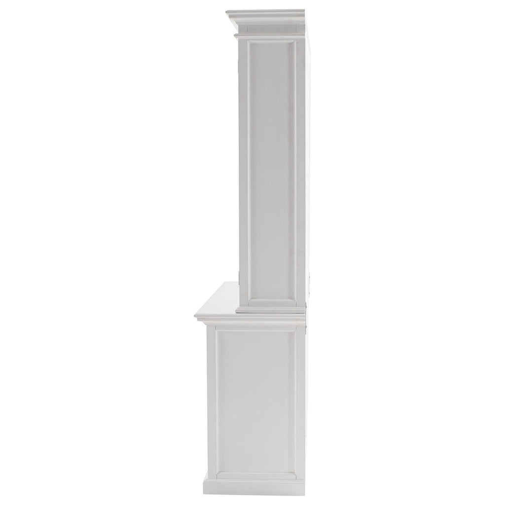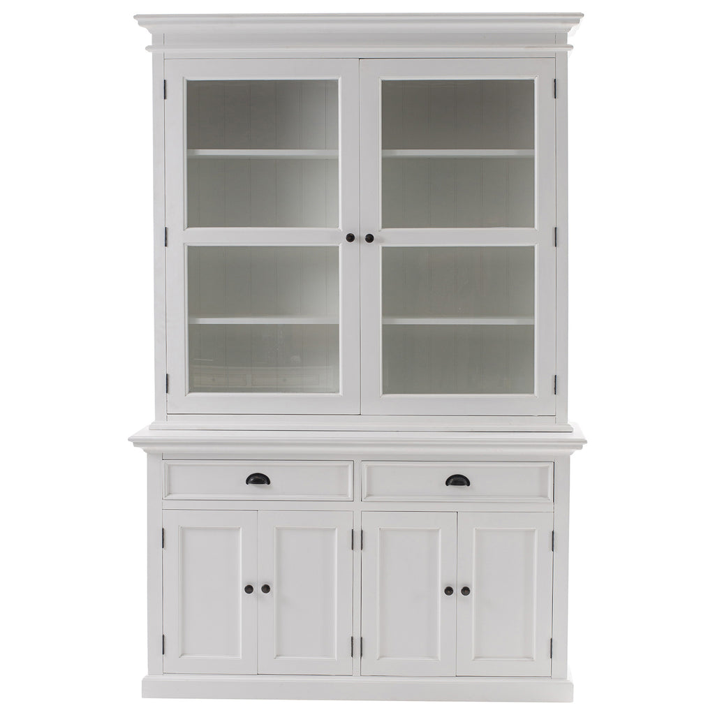 Beckton combines the quaint charm of the French Countryside with the coastal flair of the Eastern Seaboard to form a comprehensive range befitting the dining area, living space or bedroom. Detailed profiling on each piece, together with the warm finishing and antique brass hardware, provides a classic collection for the contemporary home. Generously proportioned and versatile Hutch/Bookcase can make its home in your living room or bedroom. Two separate components, working together to create ideal storage. The base unit, with its combination of drawers and deep shelving, can be home to personal items or linens. The upper shelving unit features glass doors opening on to fixed shelving. Detailed beadboard wainscoting acts as an attractive backdrop for books or collectibles.