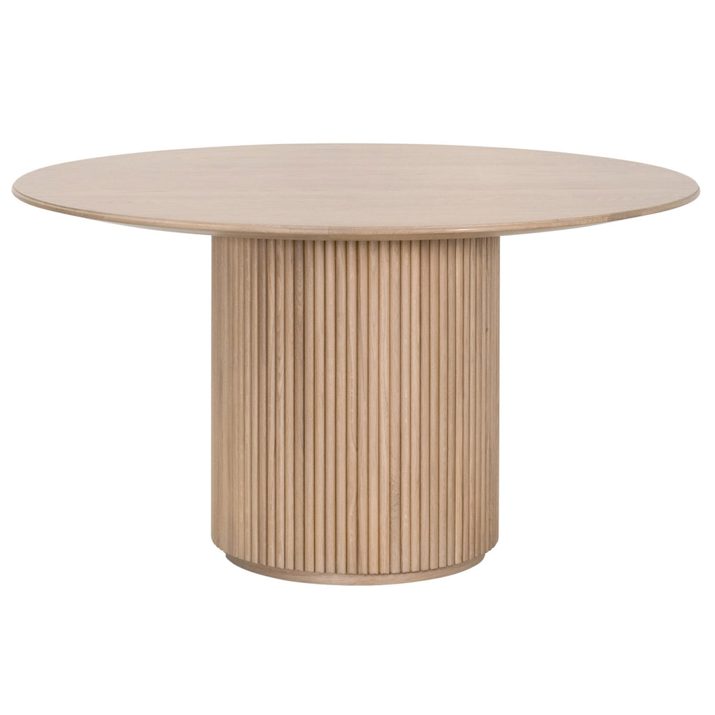 Designed to bring timeless elegance to your dining space, this Belfast 54" Round Dining Table by Essentials For Living features a natural oak finish that enhances the beauty of its solid oak wood and oak veneer construction. The pedestal base showcases decorative wood fluting, adding texture and visual appeal, while the plinth base provides stability and a modern touch. With a generous 54" diameter and 29.75" height, it comfortably seats up to four, making it perfect for intimate gatherings or family meals. Its transitional style effortlessly complements a wide range of interiors, including smaller spaces.
