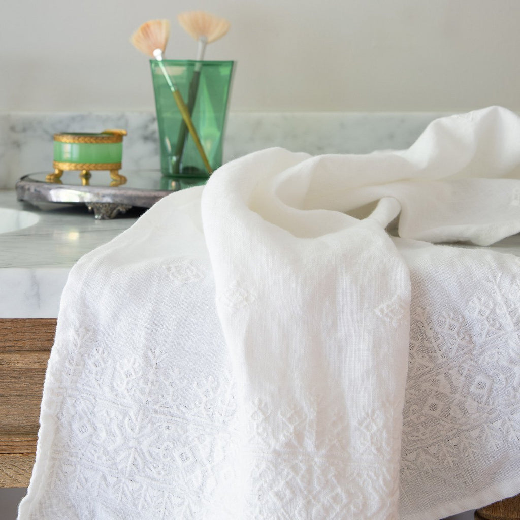 The Bella Notte Ines Guest Towel features an intricate cotton embroidery on our rich mid-weight linen. With a textural band of embroidery adorning one edge, the pattern shows subtly in a lighter hues and as a brilliant two-tone in our deeper colors. Drape in your powder room or gift to your favorite hostess — a true keepsake to share and enjoy for years.