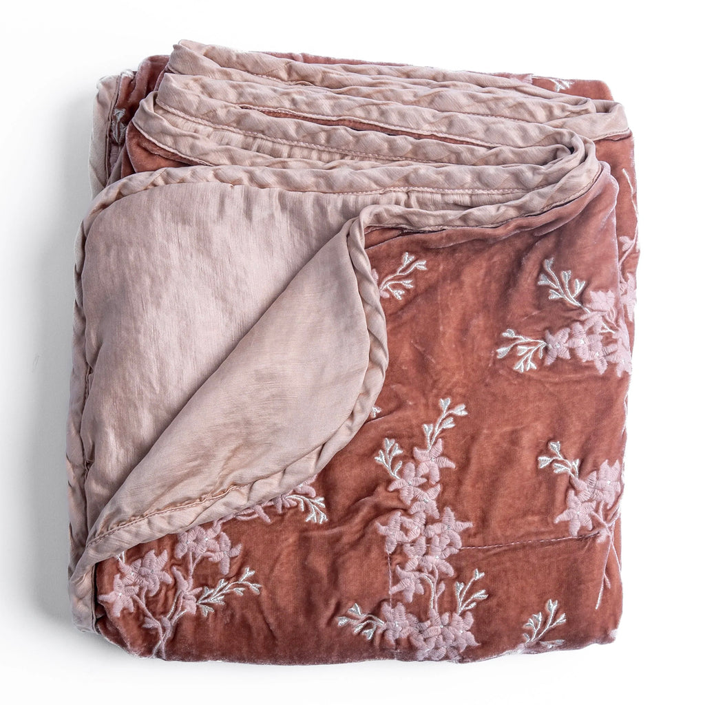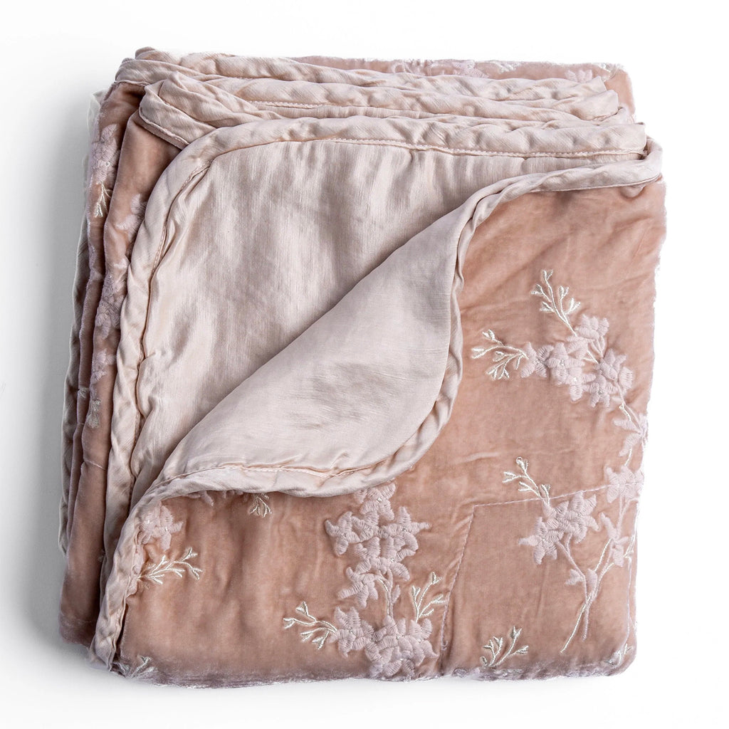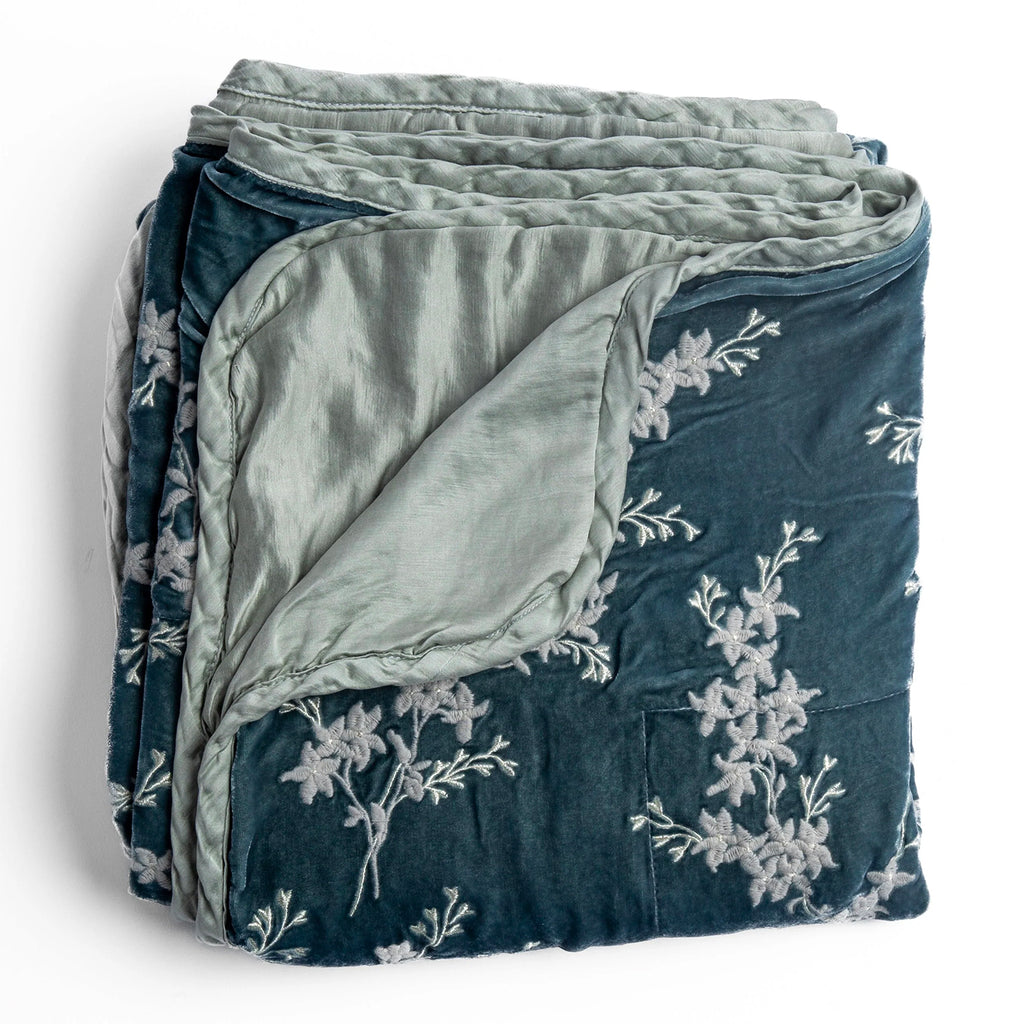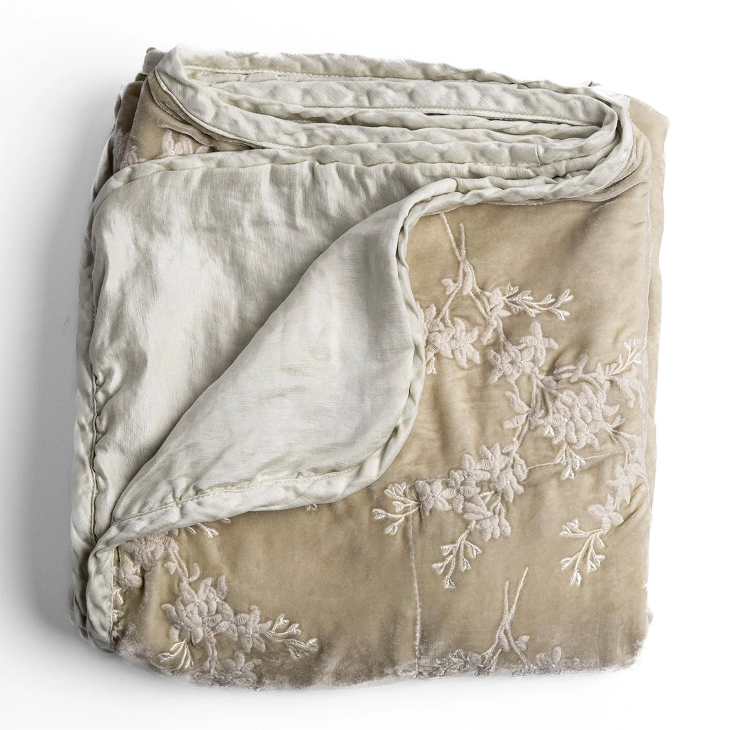 Inspired by vintage chinoiserie, the Bella Notte Lynette Blankets feature floral embroidery with pale gold accents on softly textured silk velvet. Offered in two different styles, the bed end blanket is lightly padded and backed in easy, elegant midweight linen, and the throw blanket is pure decadence unfilled and backed in silk-linen charmeuse — a work of functional art. Snuggle under these blankets with a book and a glass of wine. Machine washable, our blankets are meant to be cherished home fashion accessories.