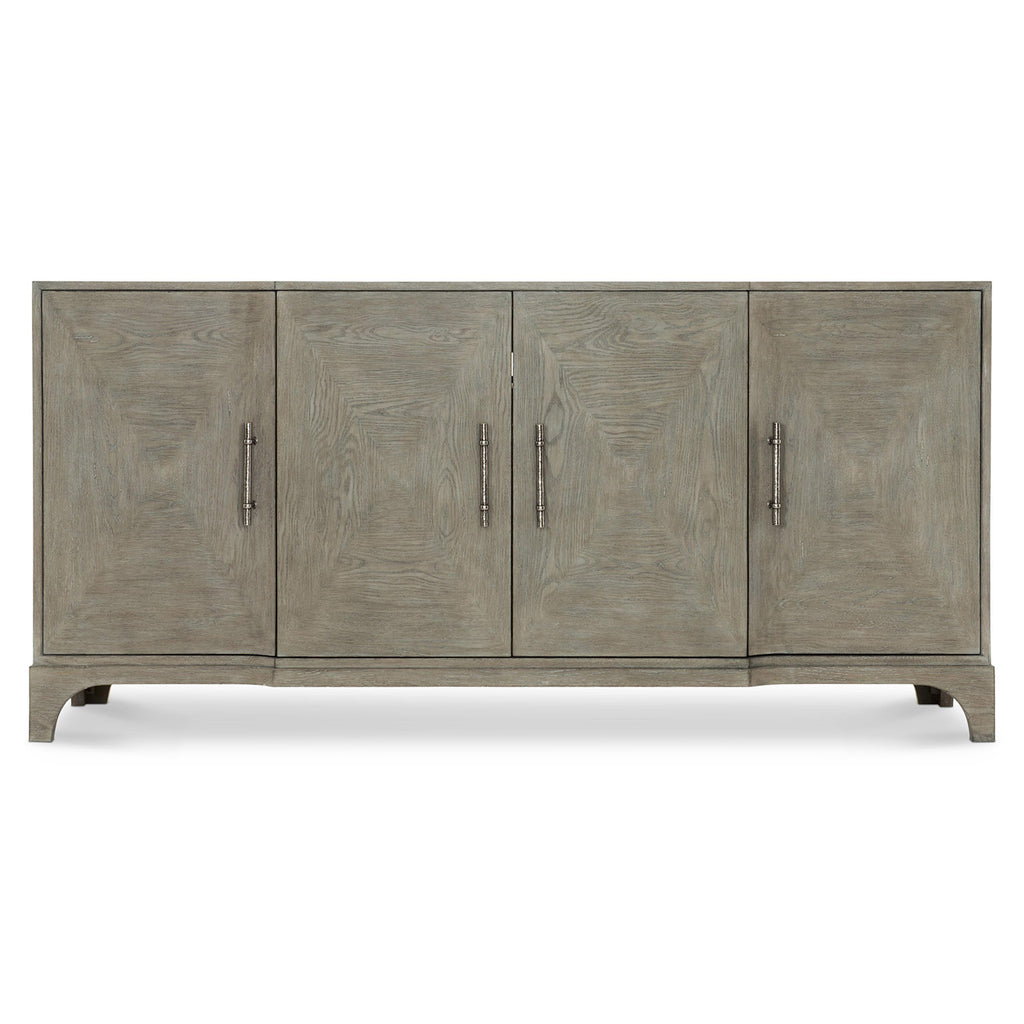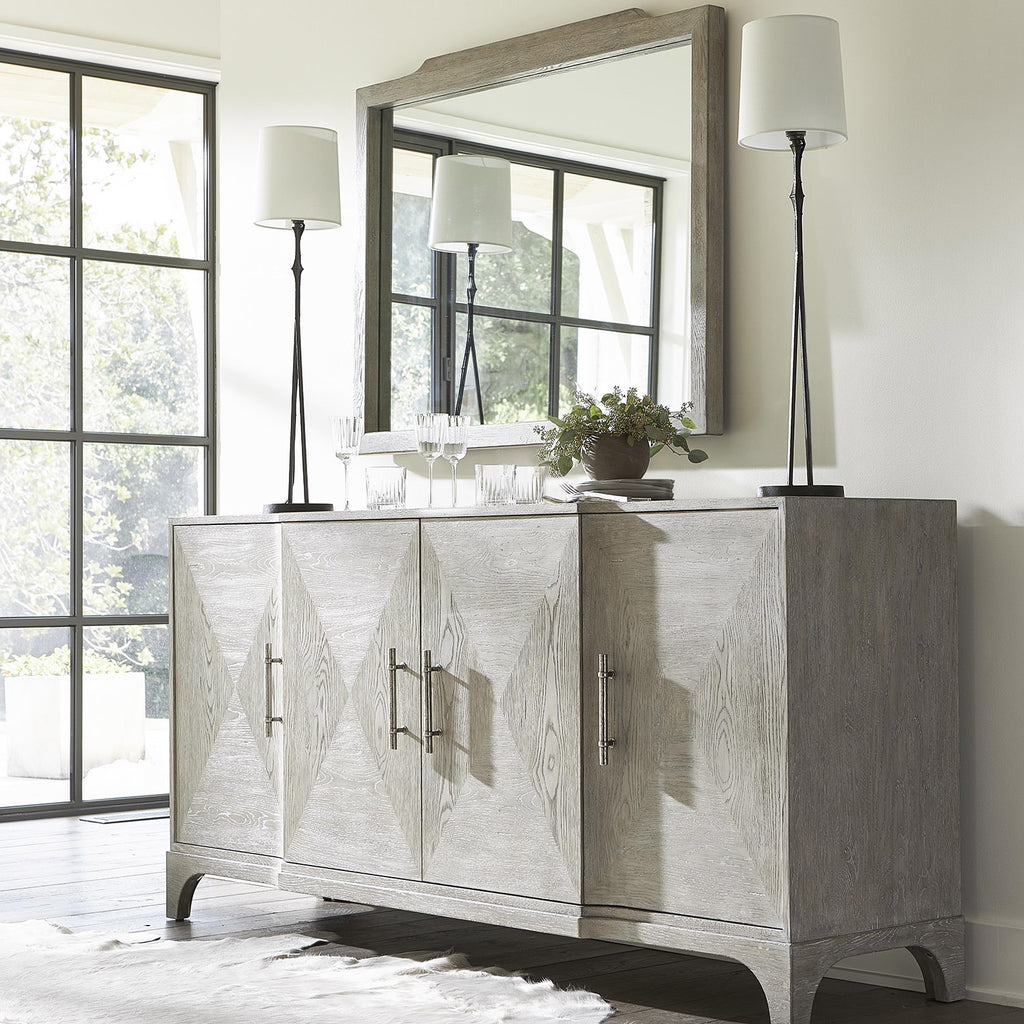 The Bernhardt Albion buffet showcases compelling style with its fancy face pattern in a Pewter finish. A versatile interior means that the buffet can be used as dining storage or an entertainment unit, including a silverware insert and cord access points. The center soft-closing doors project slightly forward in a subtle shaping inspired by traditional breakfront designs.