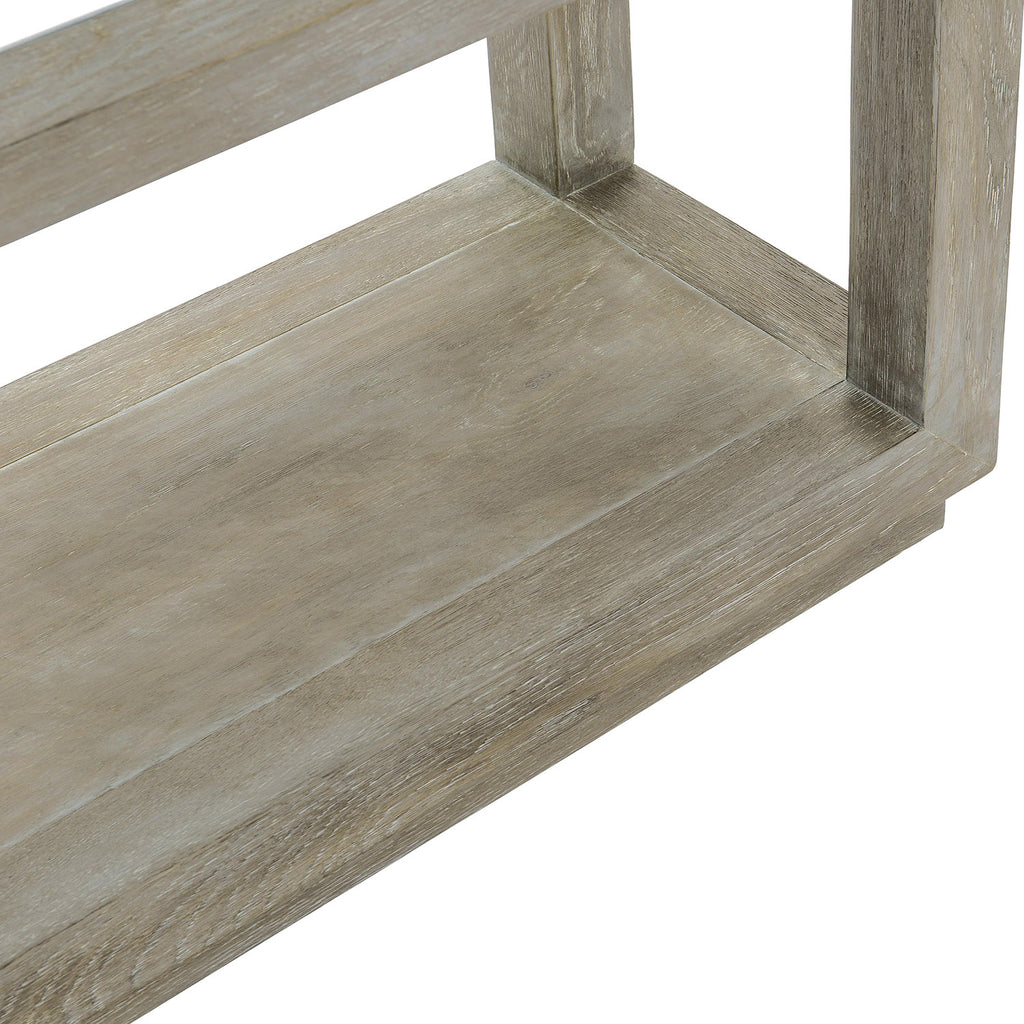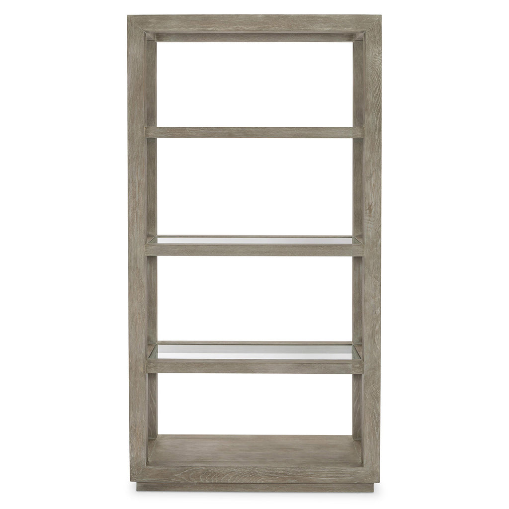 Fines lines are drawn to play a supporting role in the Bernhardt Albion etagere. From its plinth base to its open top, the design is laid-back but with a sophisticated style. Storage is offered with three fixed inset glass shelves and one wood bottom shelf surface, while the Pewter finish adds a subtle depth to the overall look.