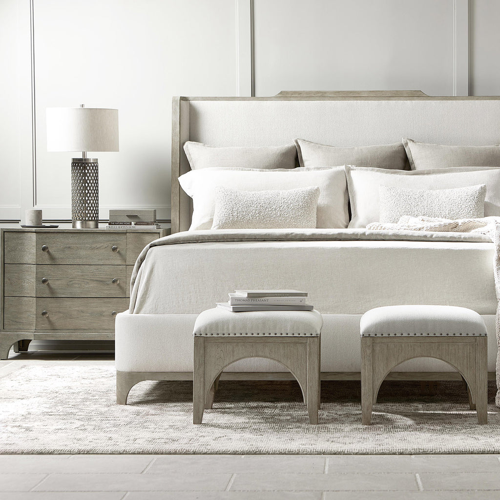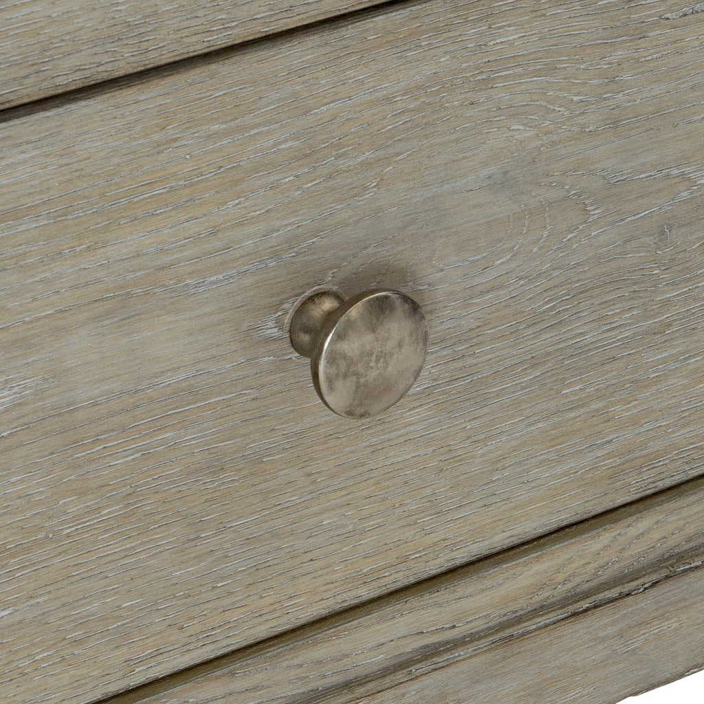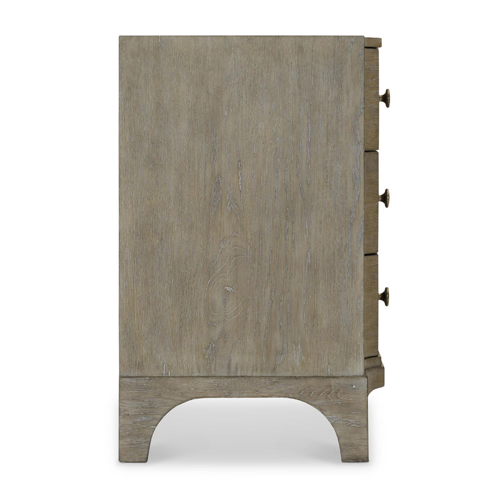 Traditional styling inspires the breakfront look of the Bernhardt Albion nightstand as the center of the drawers projects slightly forward. But this is a very modern design that includes a two-port USB charging station along the back of the case and three soft-closing drawers. Rustic elegance showcases a Pewter finish with a tactile hand, as well as cast zinc drawer pulls.