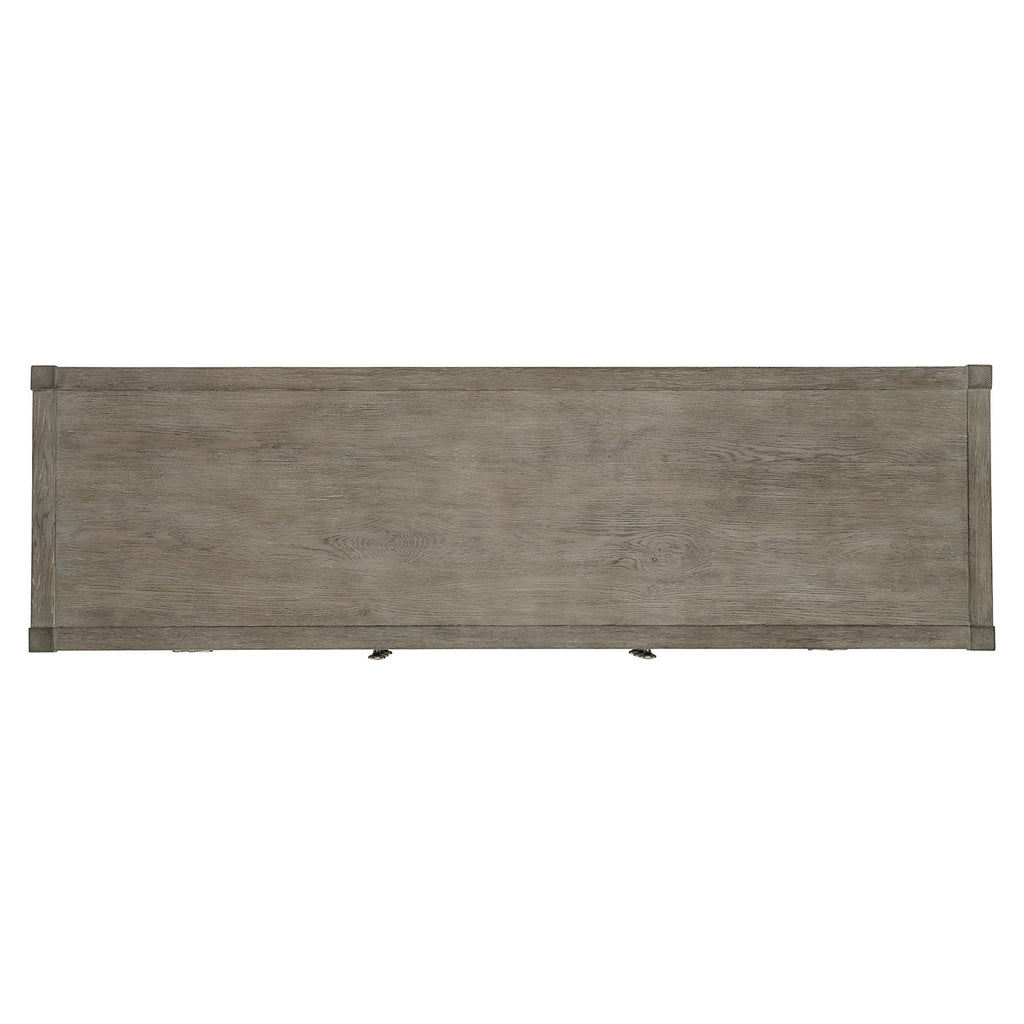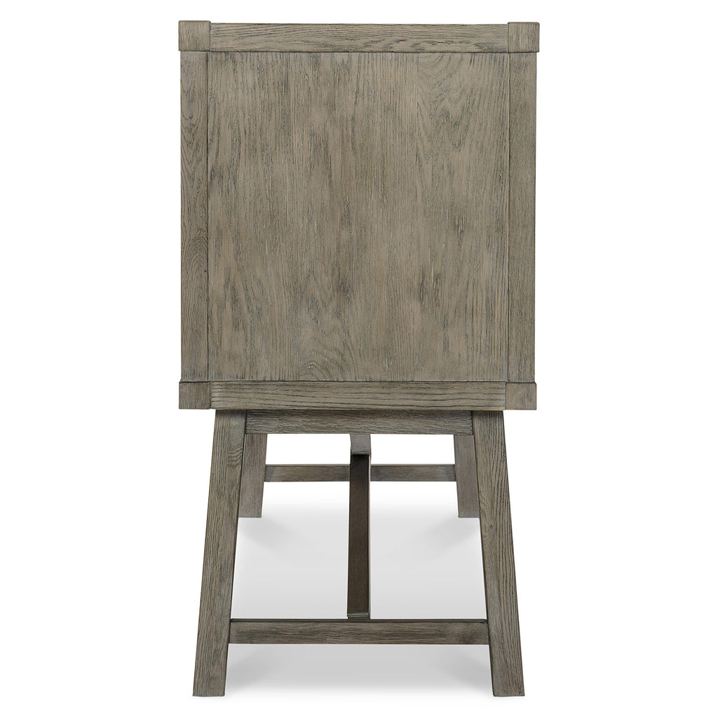 Fusion is bringing together the best of several styles. In the case of the Bernhardt Albion sideboard, that includes the X-stretcher of farmhouse style, doors and drawers that resemble midcentury modern, and the rustic charm of a weathered wood and Pewter finish. Function isn't forgotten, though. Behind each door is one adjustable, removable shelf and the top drawer has silverware insert.