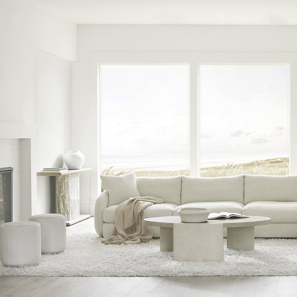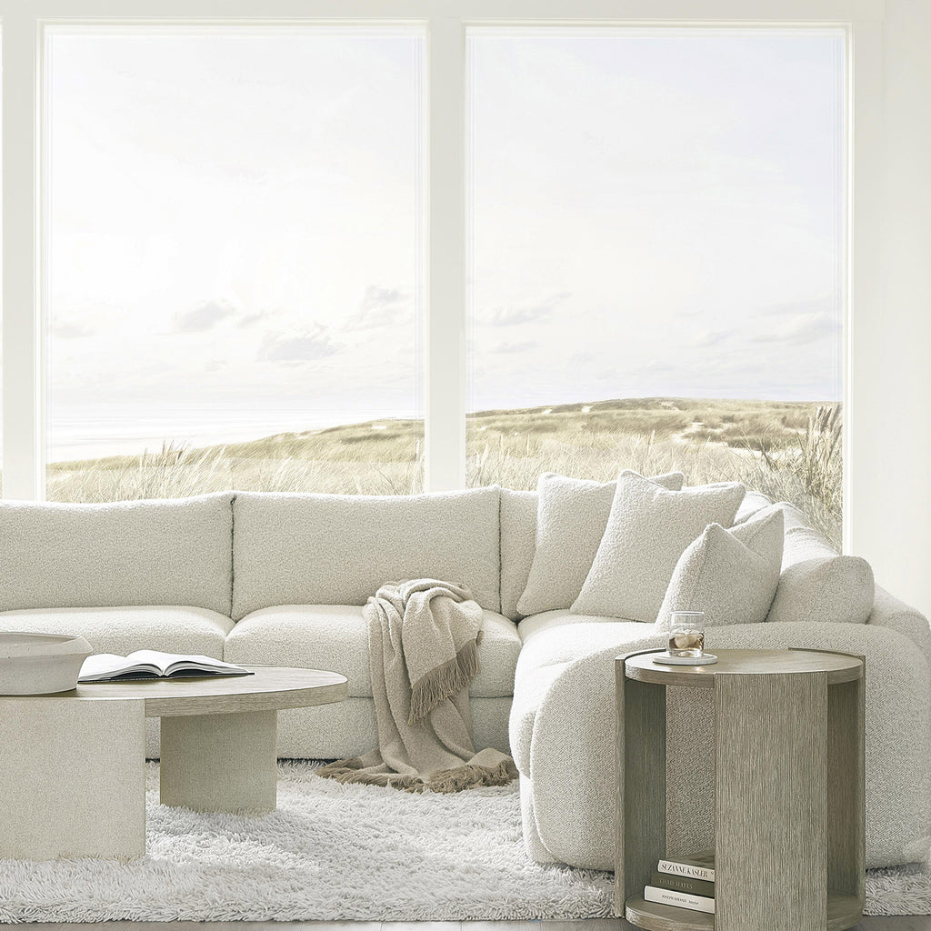 The Bernhardt Arcadia cocktail table features three raffia-wrapped legs that rise up to embrace the edges of the freeform top. The details and texture of wire-brushed oak are enhanced in Clay finish. The result is a modern organic style all its own.