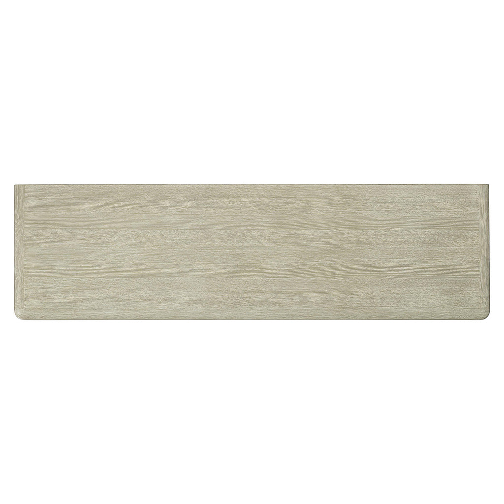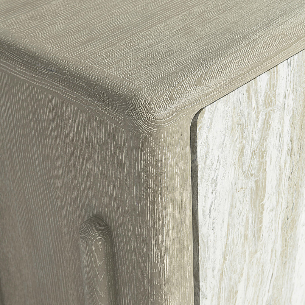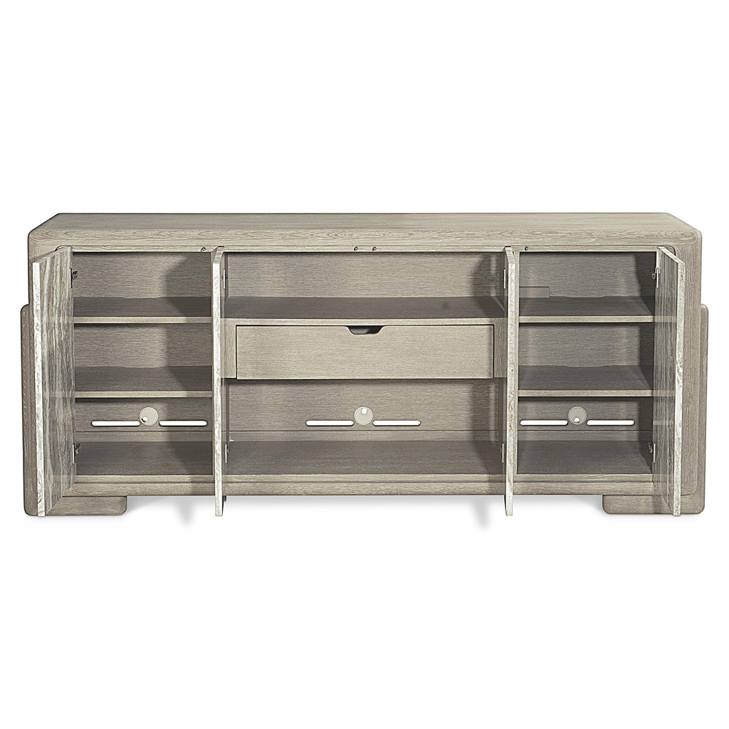 An elemental, serene design marks this stunning Bernhardt Arcadia entertainment credenza. The door fronts have faux stone overlays in Kalta finish that mimic flowing woodgrain or swirls of natural marble. A tactile element is provided by a wire-brushed oak case in Clay finish, while the interior provides functionality with adjustable shelves and a drawer. The base takes a unique approach with four supports that wrap up the sides of the credenza.