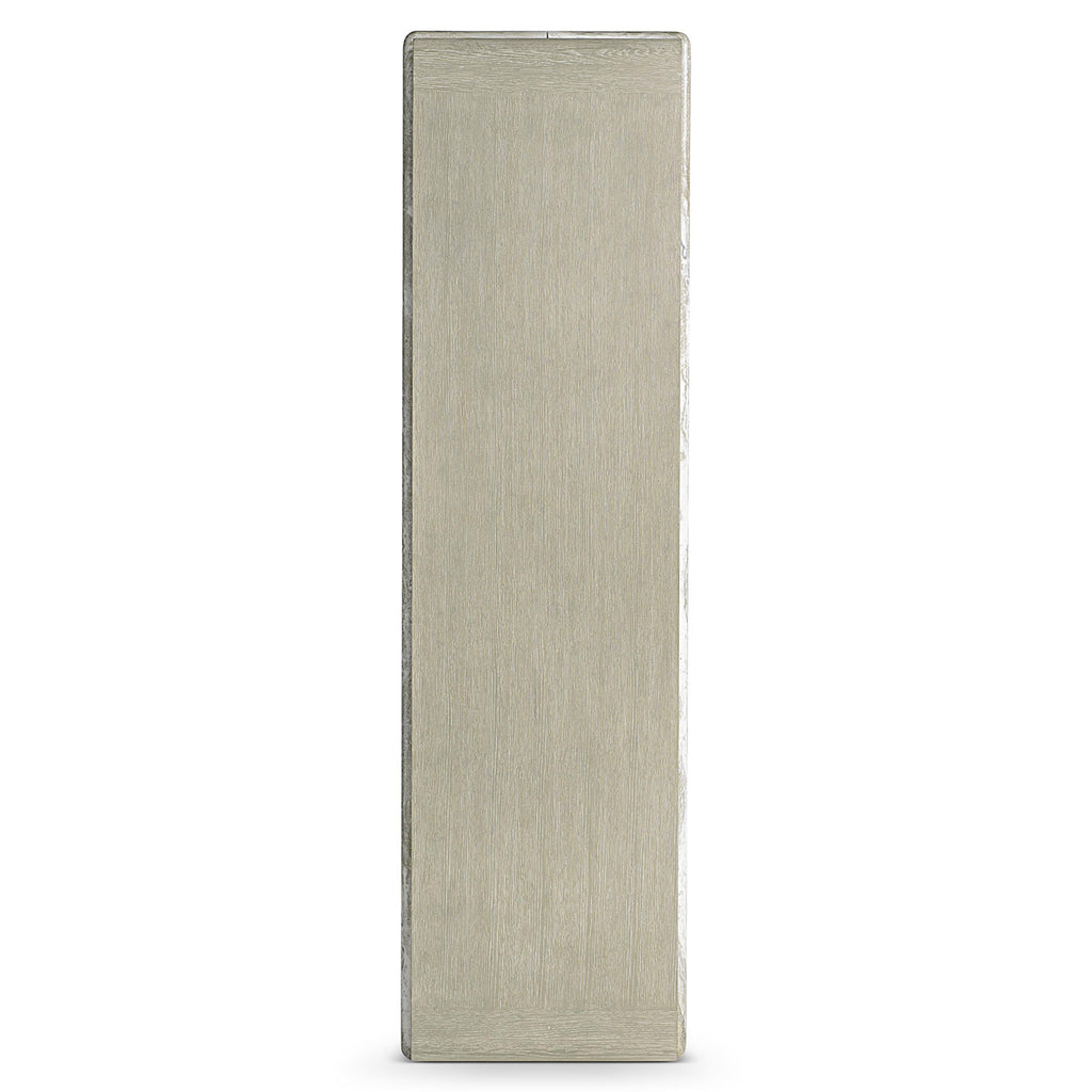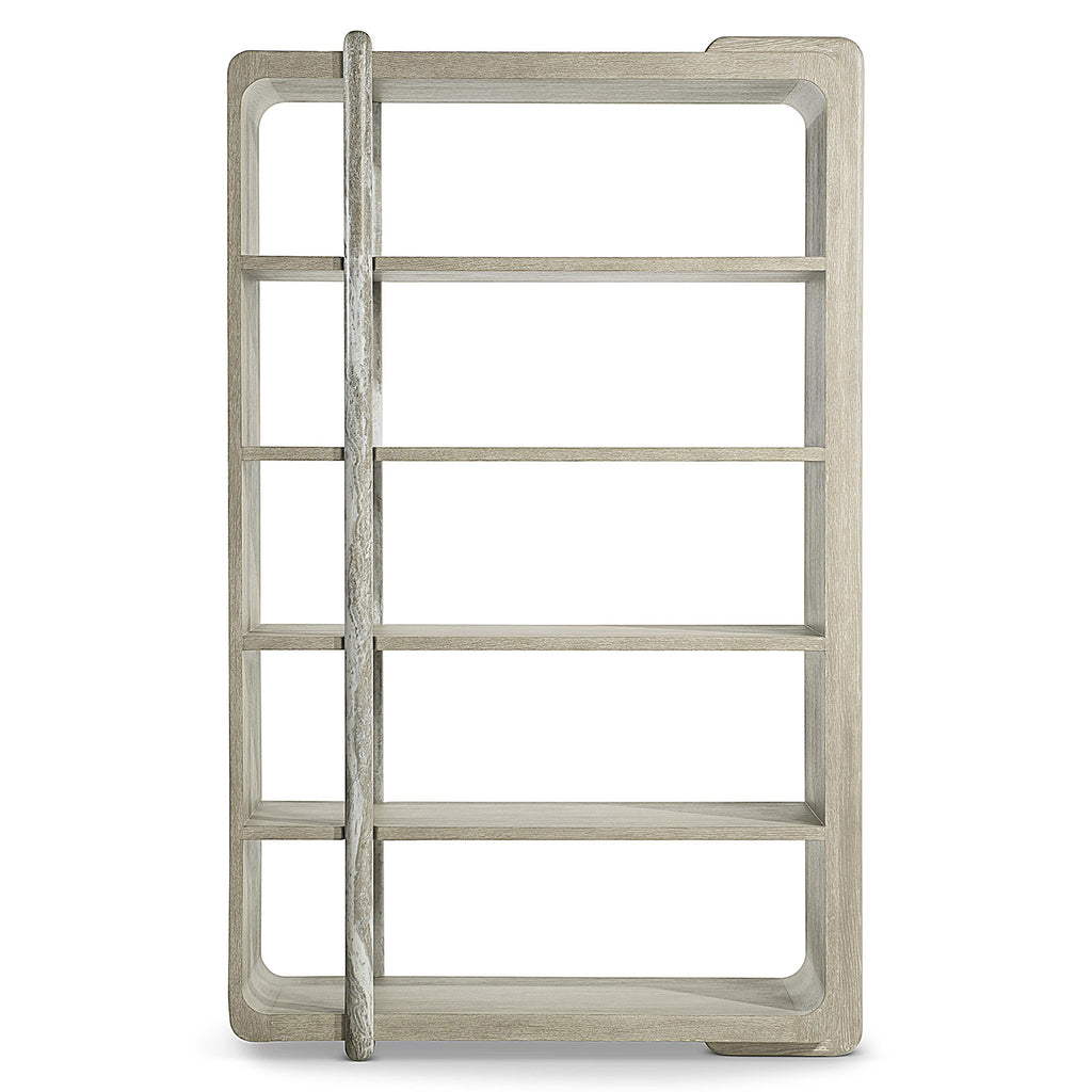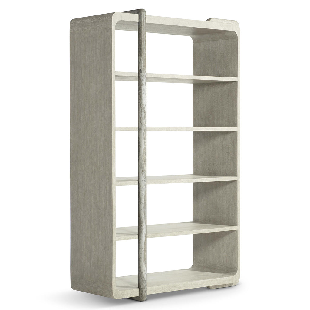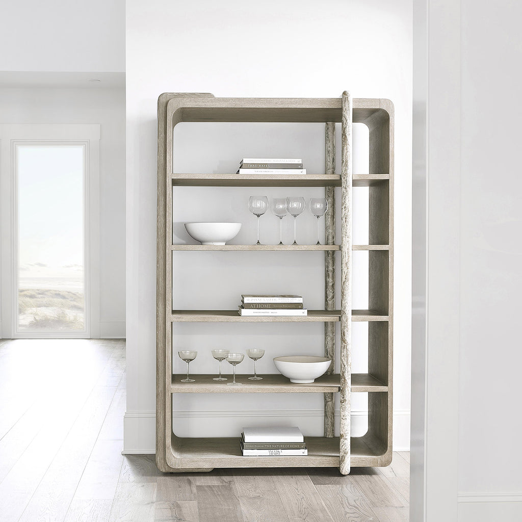 Wrapped shapes and a textural style give the Bernhardt Arcadia etagere a standout design in oak and faux stone. A rounded wood brace in Clay finish curves over one side of the case, while a faux stone post in Kalta encircles the front and back.