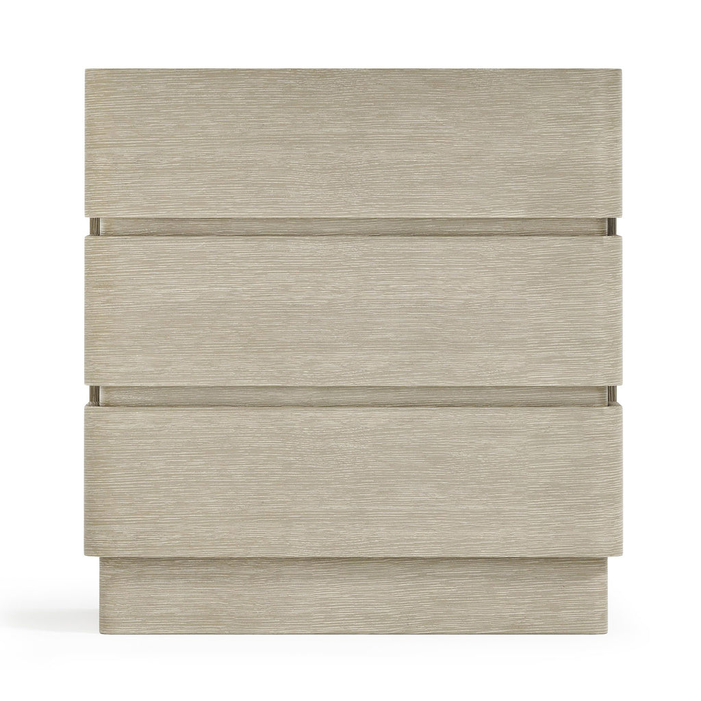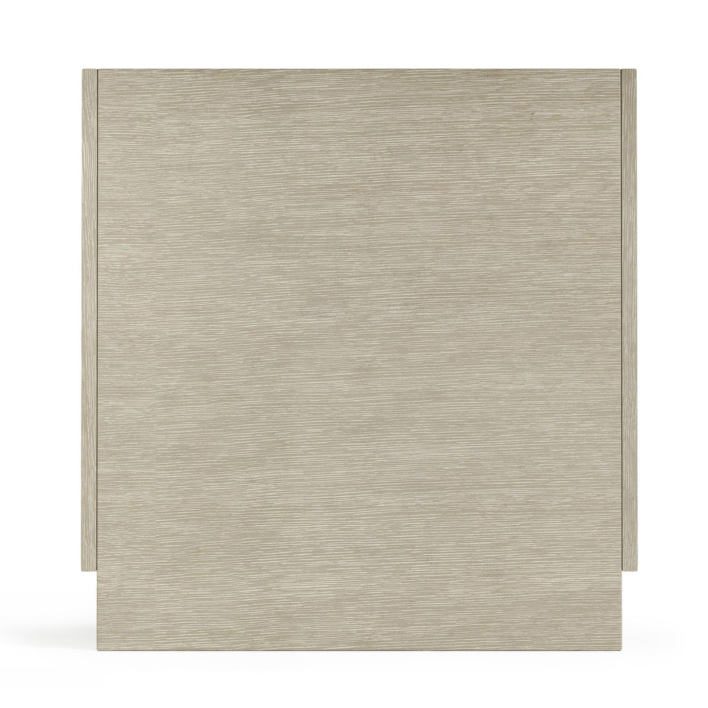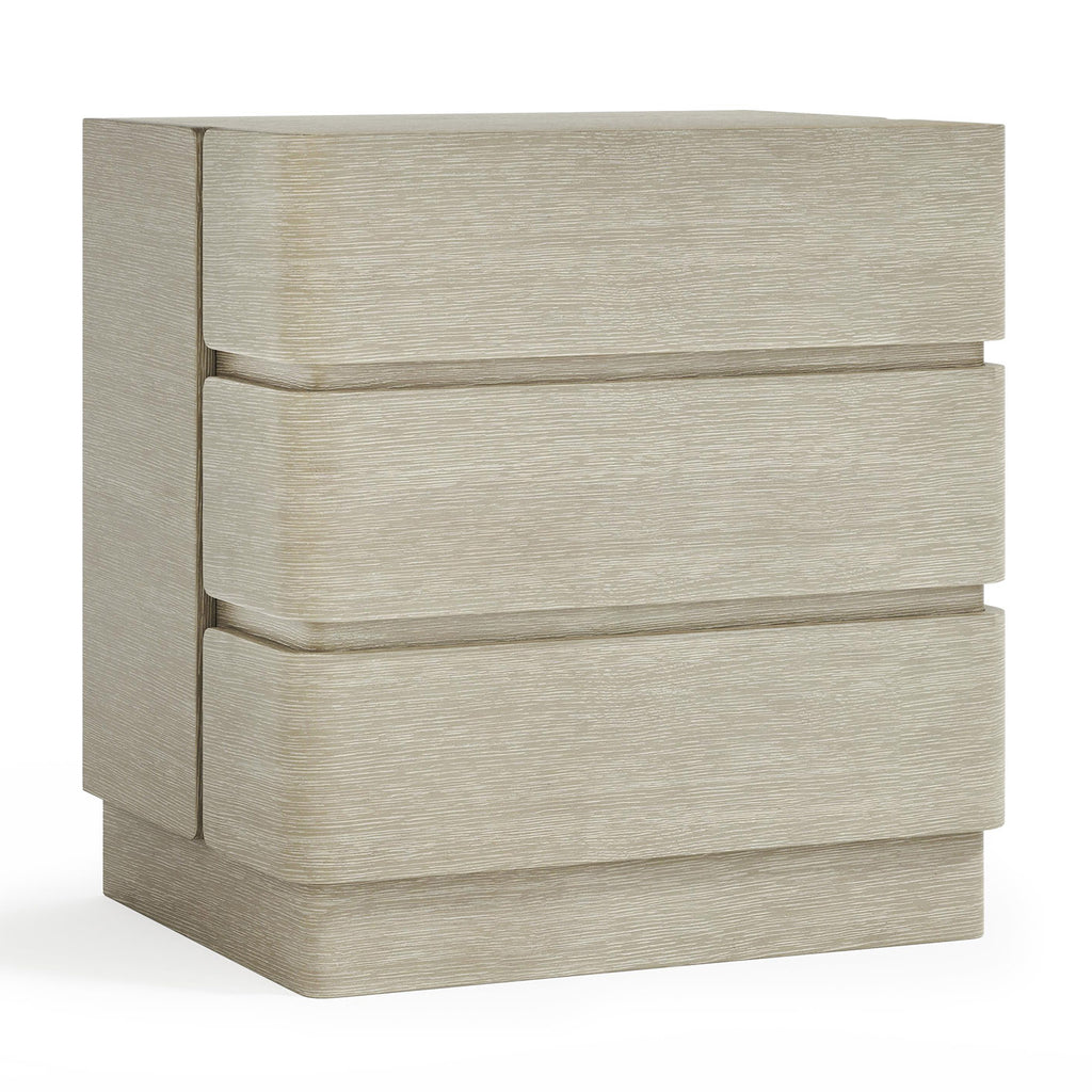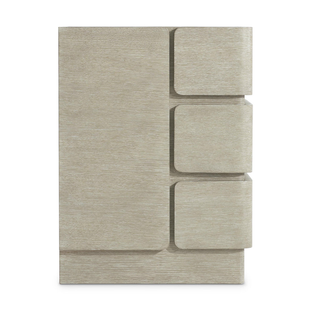 The Bernhardt Arcadia nightstand offers an understated design that is both modern and unexpected. The three drawers wrap around the sides of the case, adding a unique detail. The wire-brushed oak nightstand offers texture with a Clay finish.