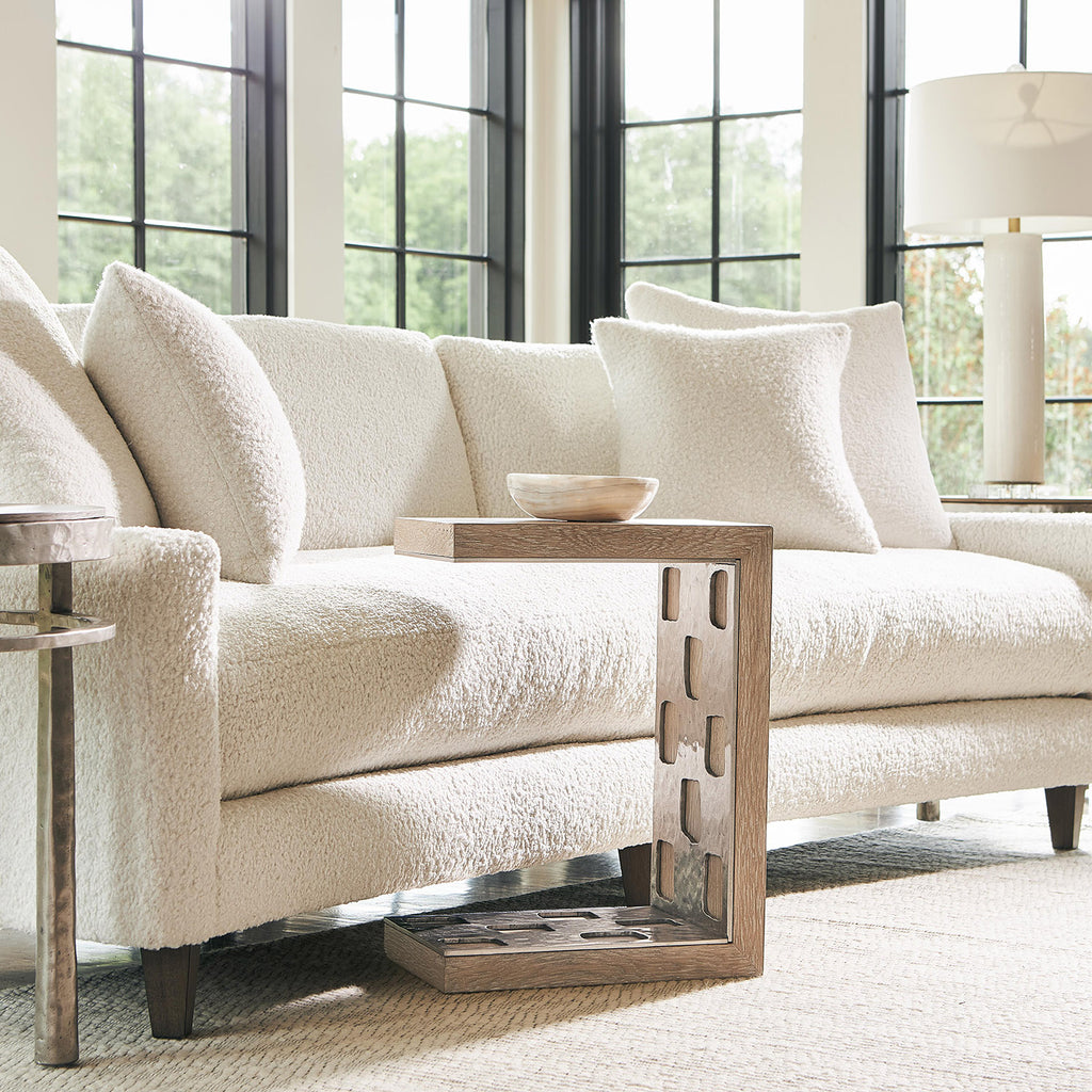 Cool California style finds its form in cast aluminum metal overlays on the Bernhardt Bernhardt Aventura accent table. Openwork freeform squares on the back and base of the C-shaped table reveal the wood frame in our Marcona finish.