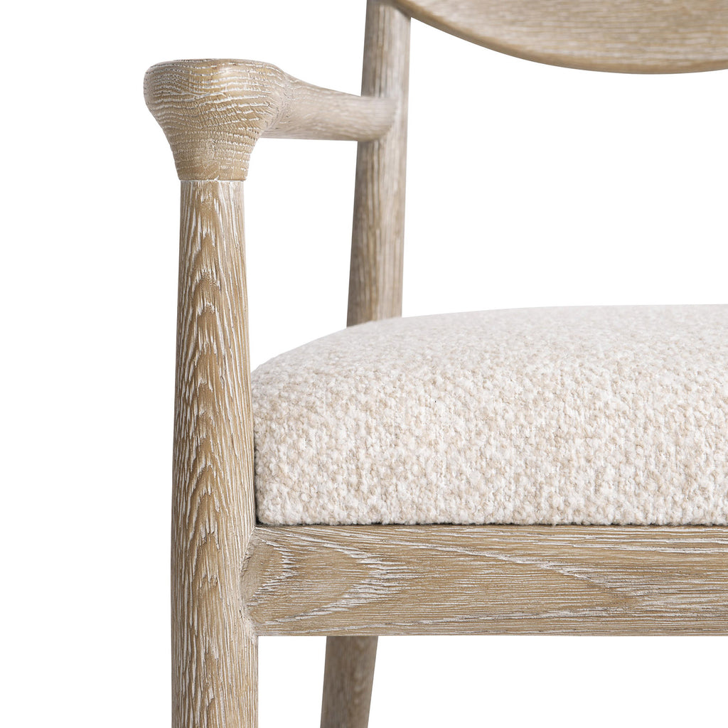 A curved back and shaped wood frame showcase the midcentury inspiration of the Bernhardt Aventura arm chair. The arms offer a uniquely rounded hand rest while the rear legs stretch up to meet the back. An upholstered seat adds comfort, and the wood frame takes a warm turn in our Marcona finish.