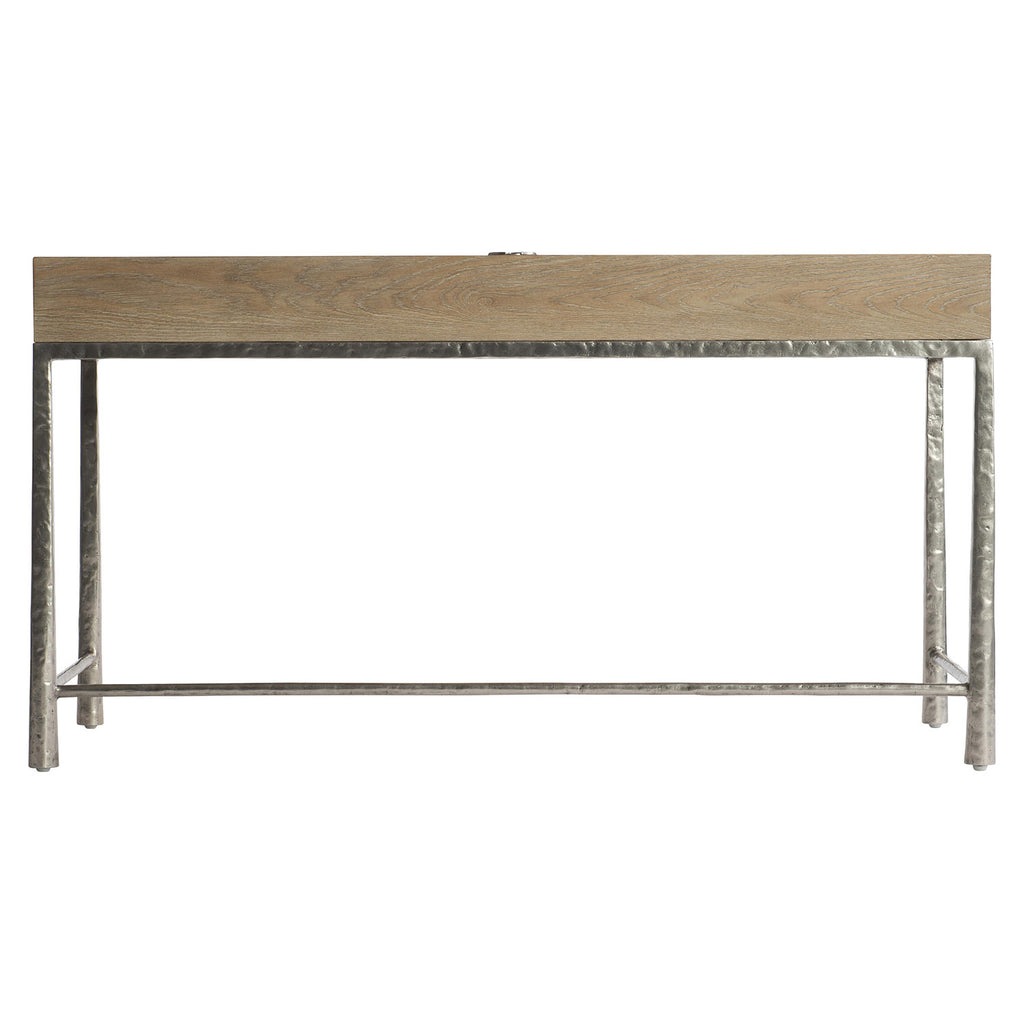 A beautiful textured aluminum frame supports a wood top on the Bernhardt Aventura desk. The dimensional shaping on the desk top's three drawer fronts complements the tapered legs. A power unit on the top offers function with two USB ports and two outlets.