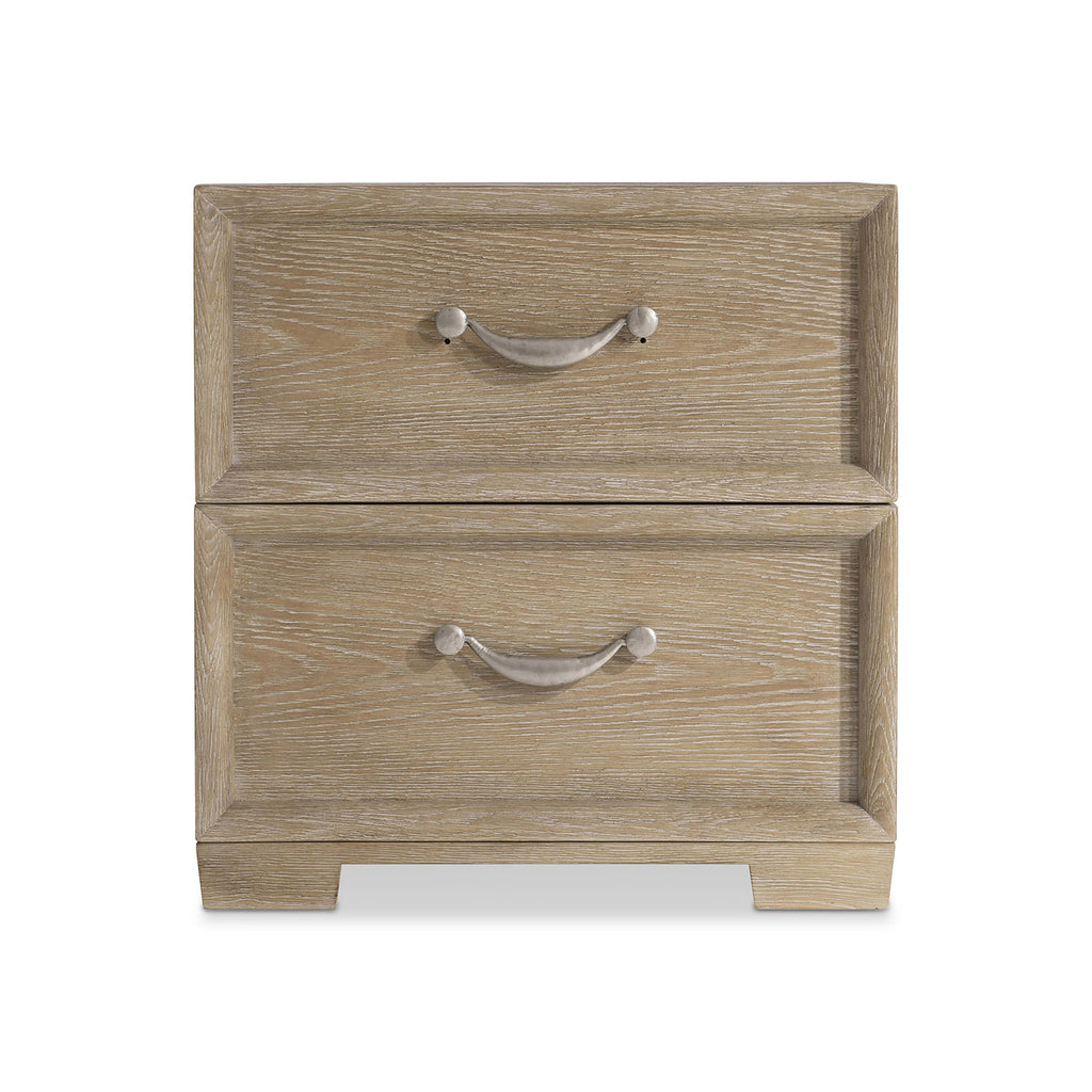 The Bernhardt Aventura nightstand highlights the dimensional designs that are a signature of this collection. Two soft-close drawers are defined by cast resin molding, surrounding bold metal hardware. A two-port USB charging unit is included on the back. Finished in our wood Marcona finish', the nightstand crafts a relaxed California style.