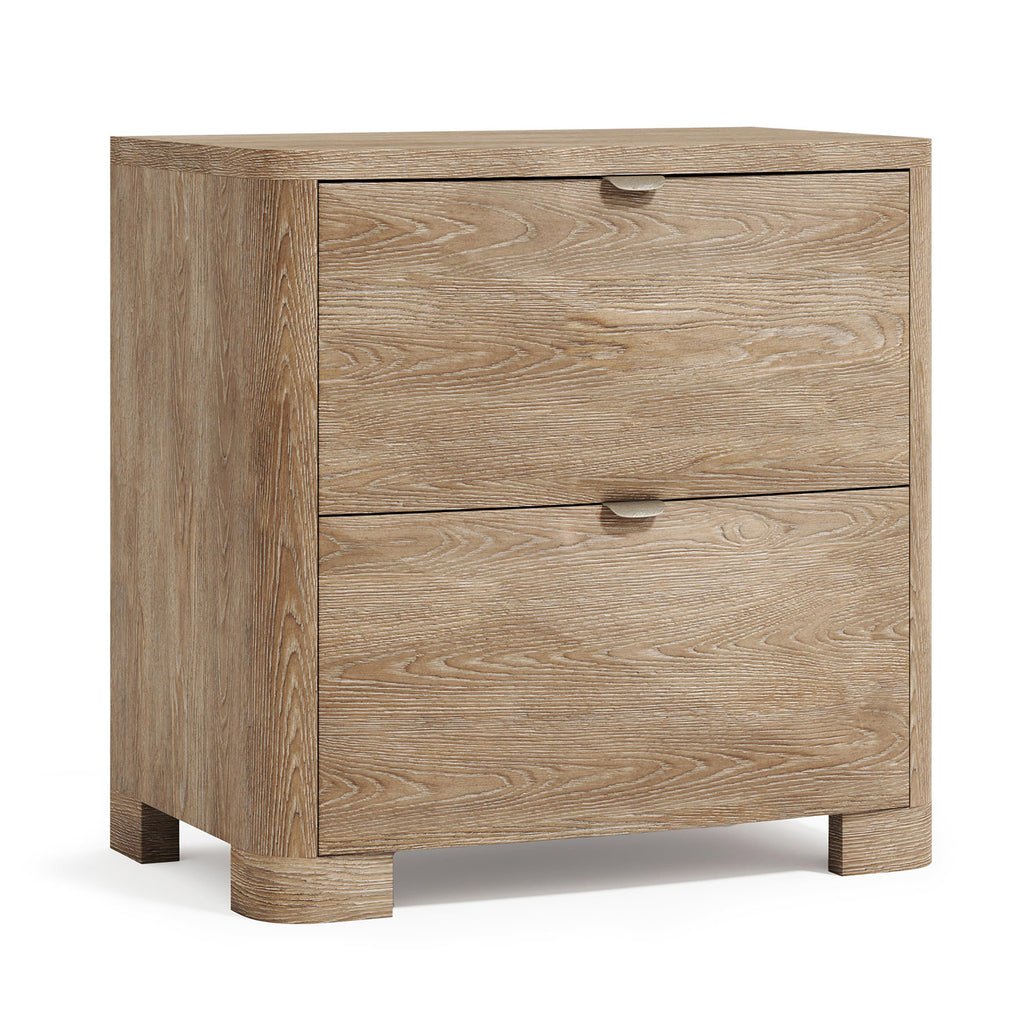 Dimensional pyramid shaping draws all eyes to the Bernhardt Aventura nightstand. A bow front design offers two drawers with tab pulls. Added function includes a two-port USB charging system on the back of the case. A Marcona finish adds a chic but rustic look as the perfect final touch.