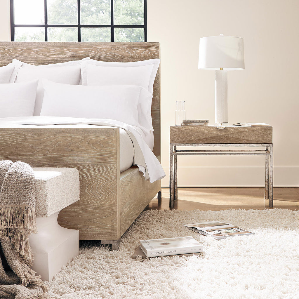 Simple lines craft a quietly sophisticated look on the Bernhardt Aventura panel bed. Inspired by relaxed California style, the wood grain shines through the Marcona finish. Cast metal feet in a Frosted Nickel finish support the headboard and footboard for a chic rustic detail.