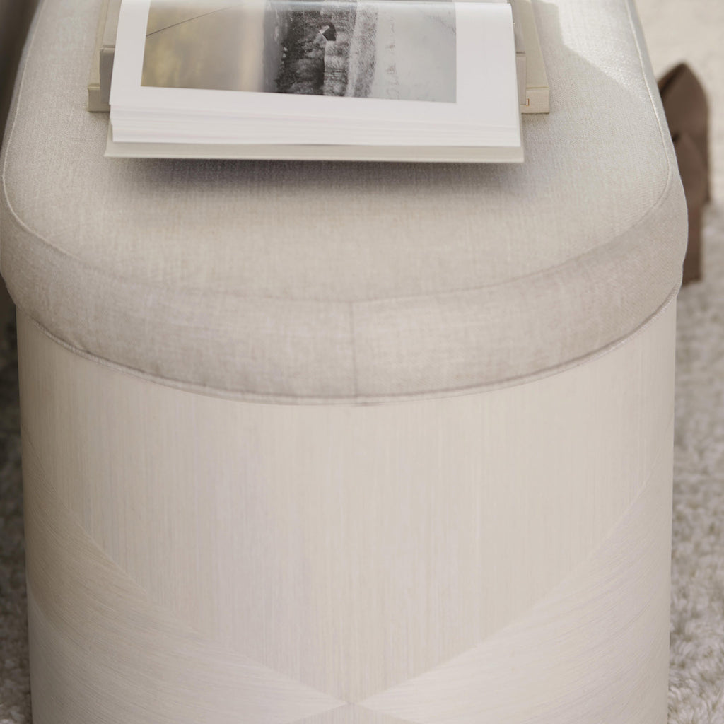 Anything but ordinary, the Bernhardt Axiom bench blends a clean, modern aesthetic with glamorous transitional style. The oblong base features a rectangular opening in the center and a triangular veneer pattern on either end. Poplar solids and engineered faux anigre veneers are presented in a silky, low-sheen Linear White finish. The look is sophisticated, but the feel is warm and inviting.