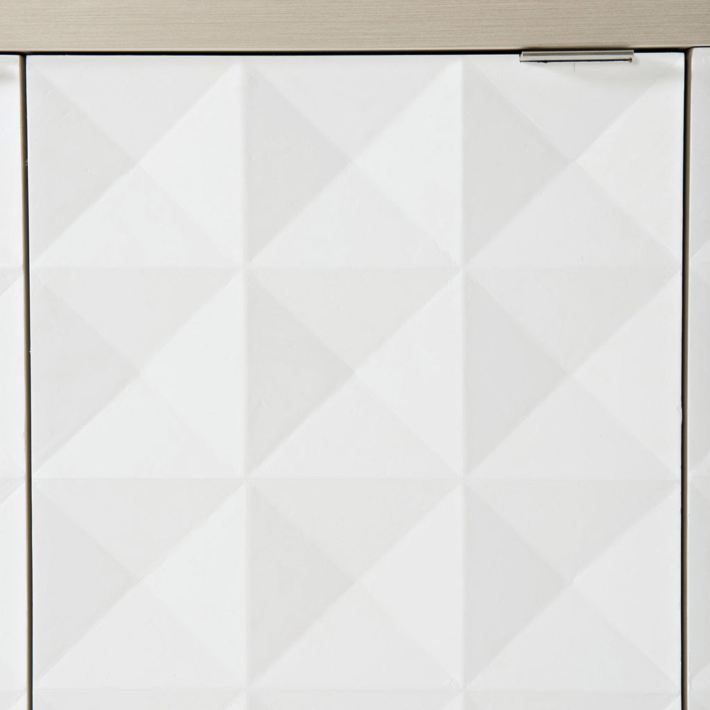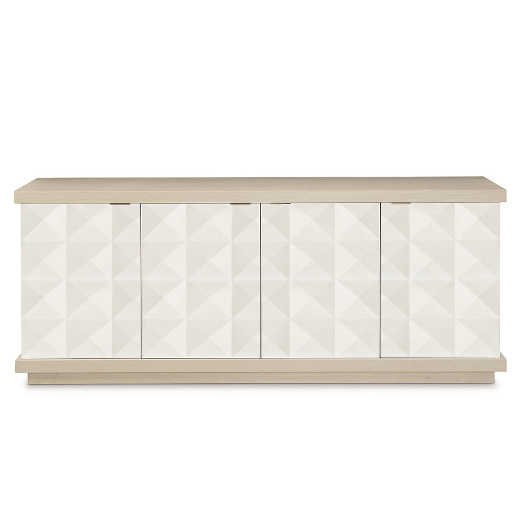 The Bernhardt Axiom buffet creates a fresh, modern look by merging clean lines with a dynamic 3-D motif of an inverted pyramid. This expertly crafted piece features engineered faux anigre veneers in two silky yet low-sheen finishes, Linear White and Linear gray. These serve as the perfect complement to the hand-applied plaster overlays on the doors, finished in White Linen. With its sleek form and unique materials, this glamorous transitional buffet makes a sophisticated statement.