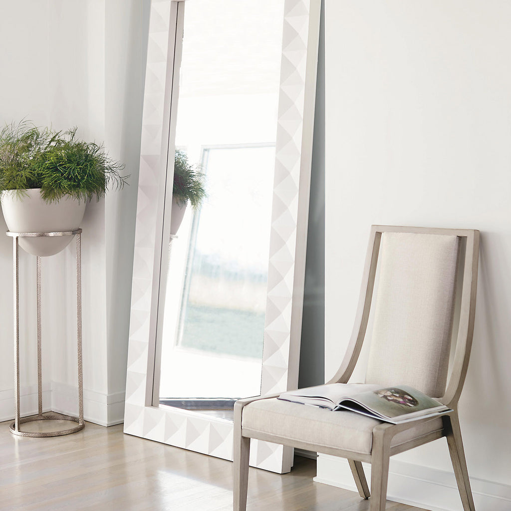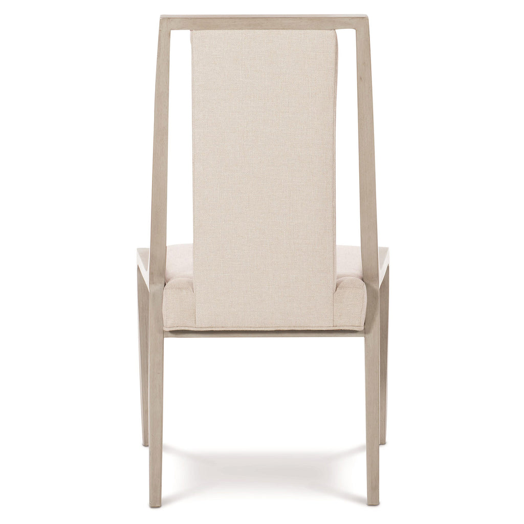 With clean, elegant lines and a muted palette, the Bernhardt Axiom side chair offers glamorous transitional style. The sleek exposed frame is finished in Linear Gray, complementing the neutral tone of the upholstery. The simple form and soft hues relax the formal tone of this sophisticated design, achieving a look that is clean and modern, but warm and inviting.