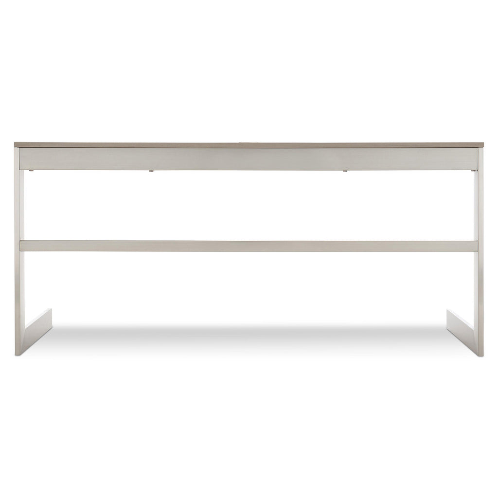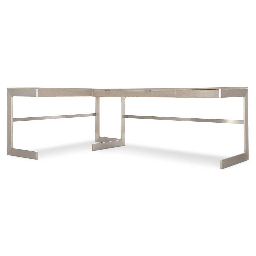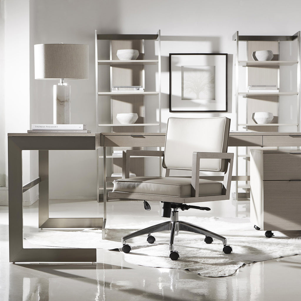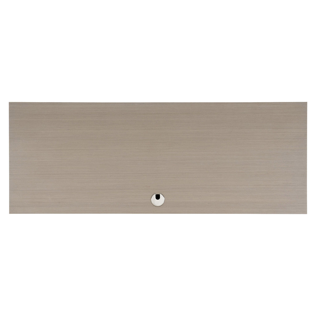 Elegant in its simplicity, the Bernhardt Axiom desk presents a minimalist design with a focus on functionality. Three slender drawers open with sleek metal pull tabs. A metal grommet hole, two USB ports and a two-plug outlet allow discreet storage and wire management for a clean look. A linear wood grain lends subtle sophistication, while the cantilevered stainless steel base shimmers in Brushed Silver finish.