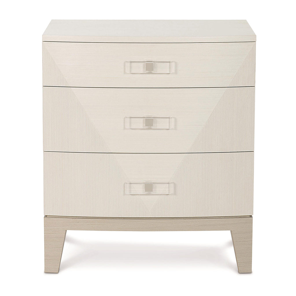 Bernhardt Axiom is a glamorous transitional furniture collection with a modern slant. Crafted from poplar solids and engineered faux anigre veneers, the Axiom nightstand uses a sophisticated palette of silky yet low-sheen finishes. The softly curved front and inverted pyramid design elevate the visual appeal of this piece. Clear acrylic is combined with metal for hardware with a fresh and unique feel. With clean lines and a sleek form, this three-drawer nightstand remains a warm and inviting staple for the bedroom.